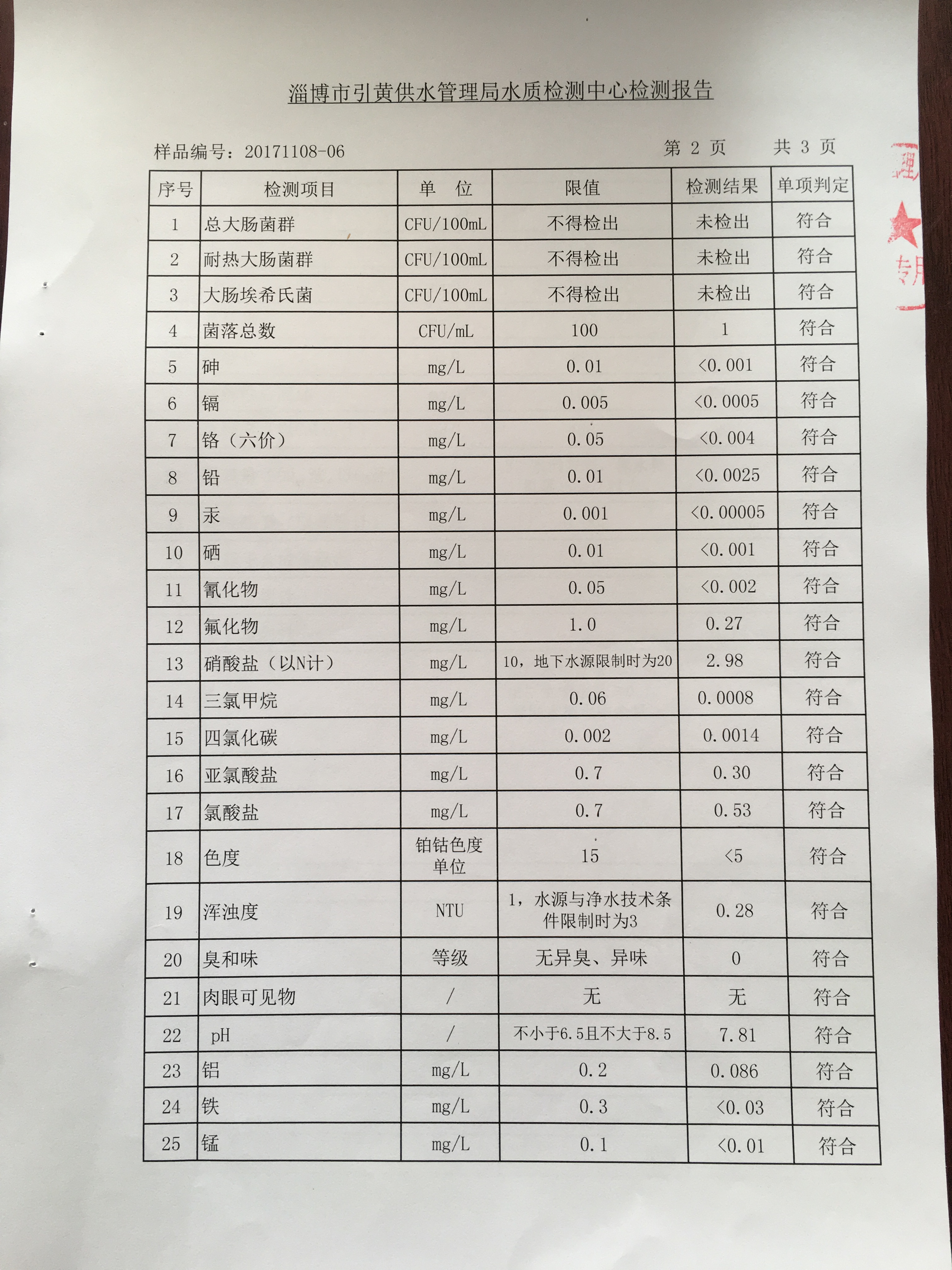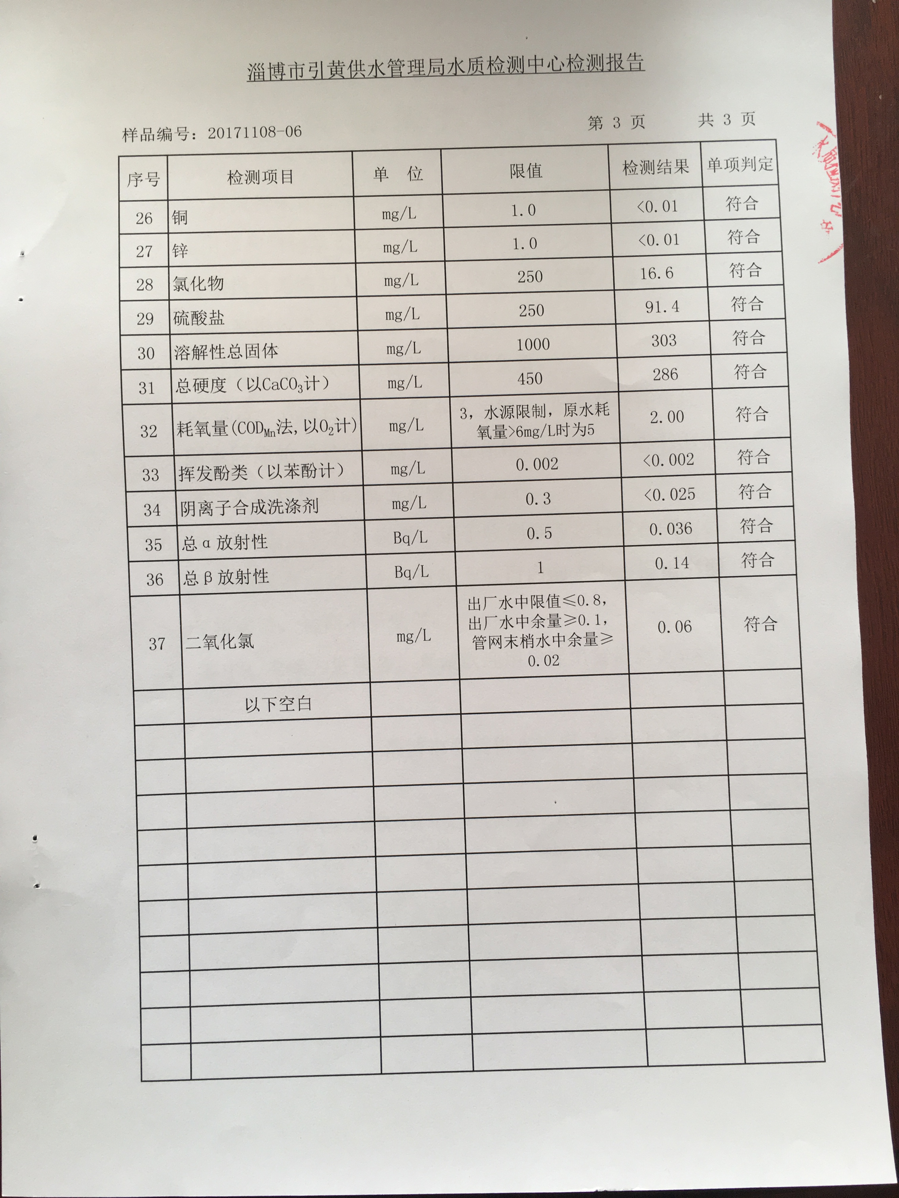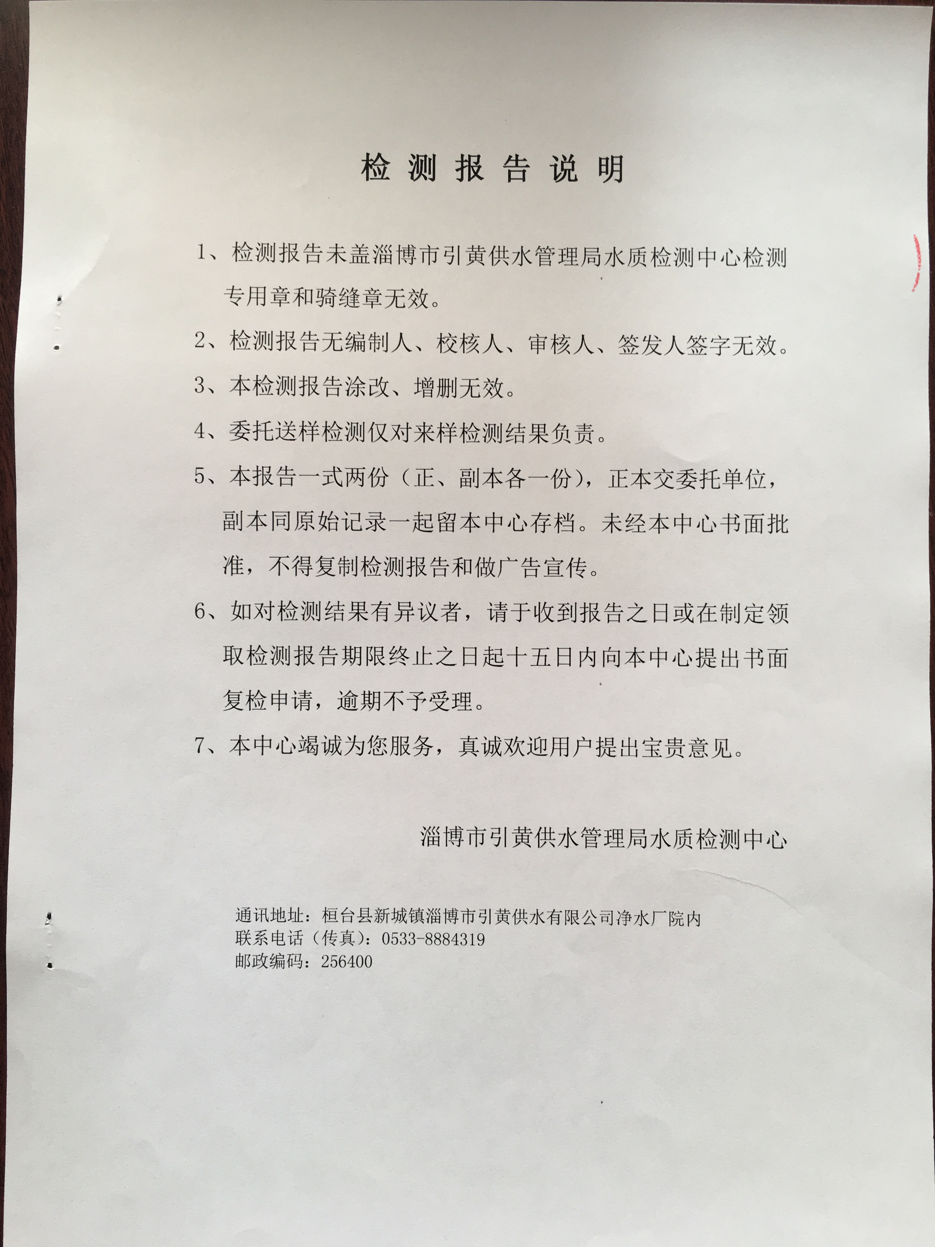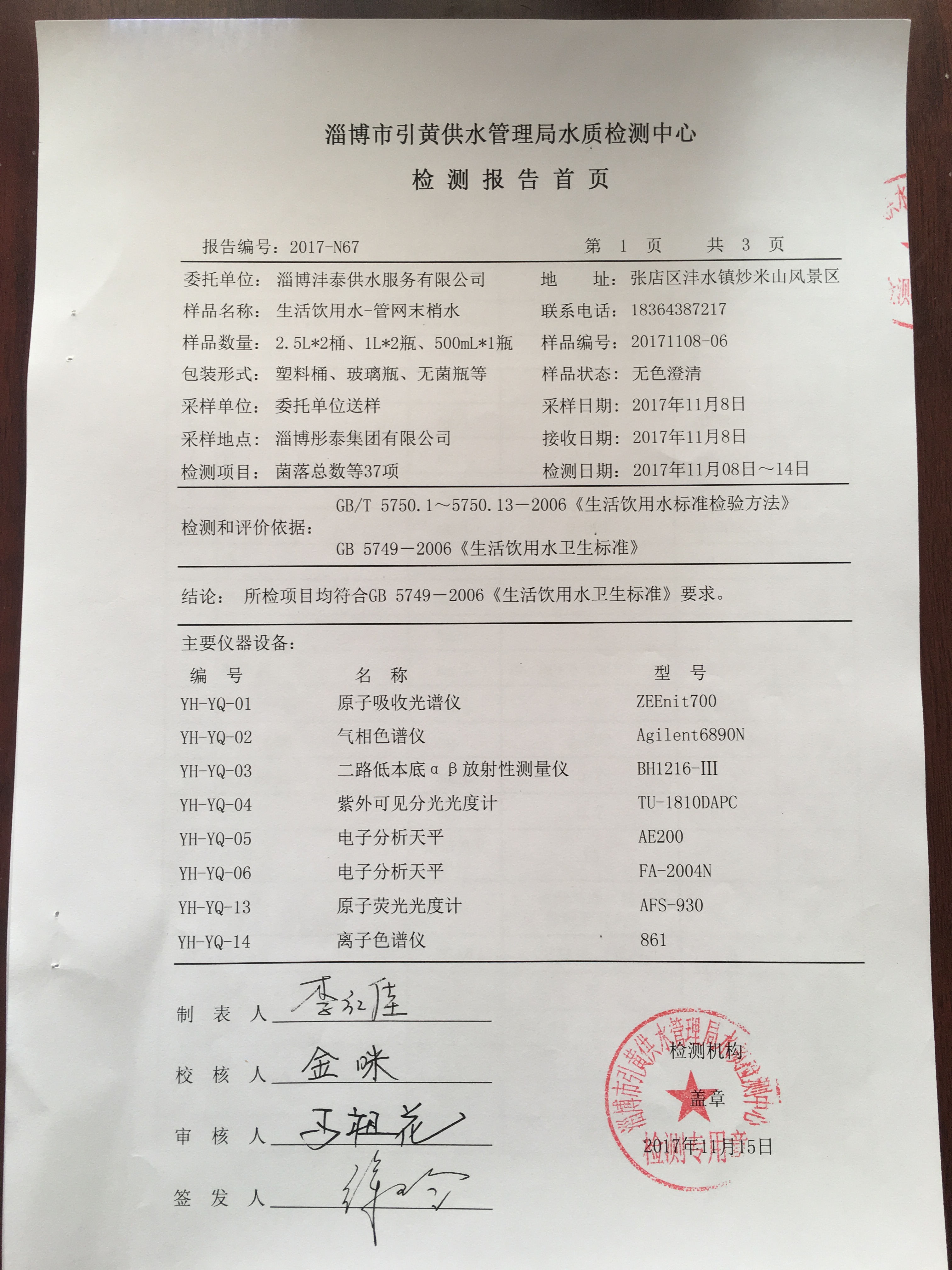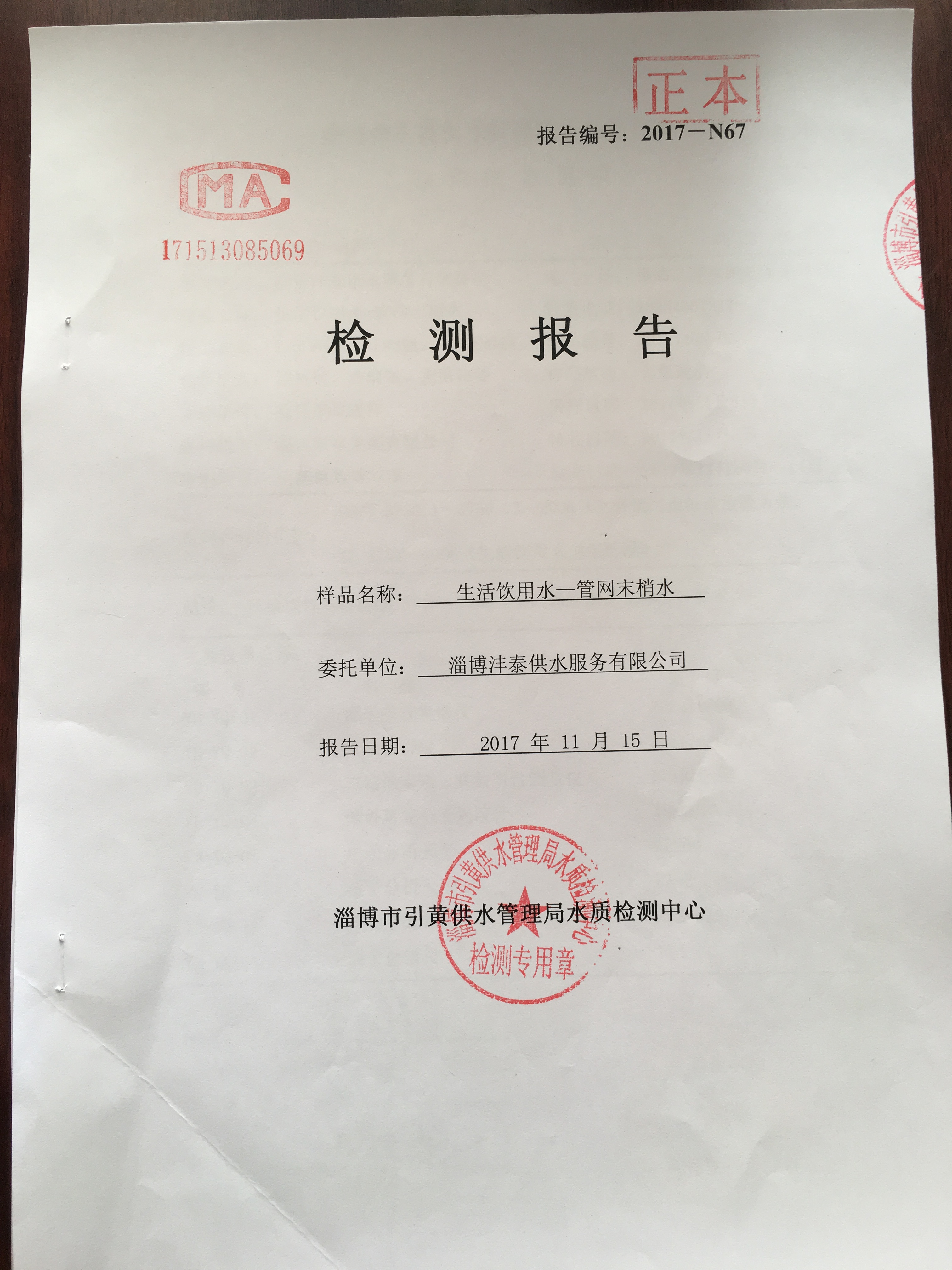 淄博沣泰供水服务有限公司管网水检测月报表