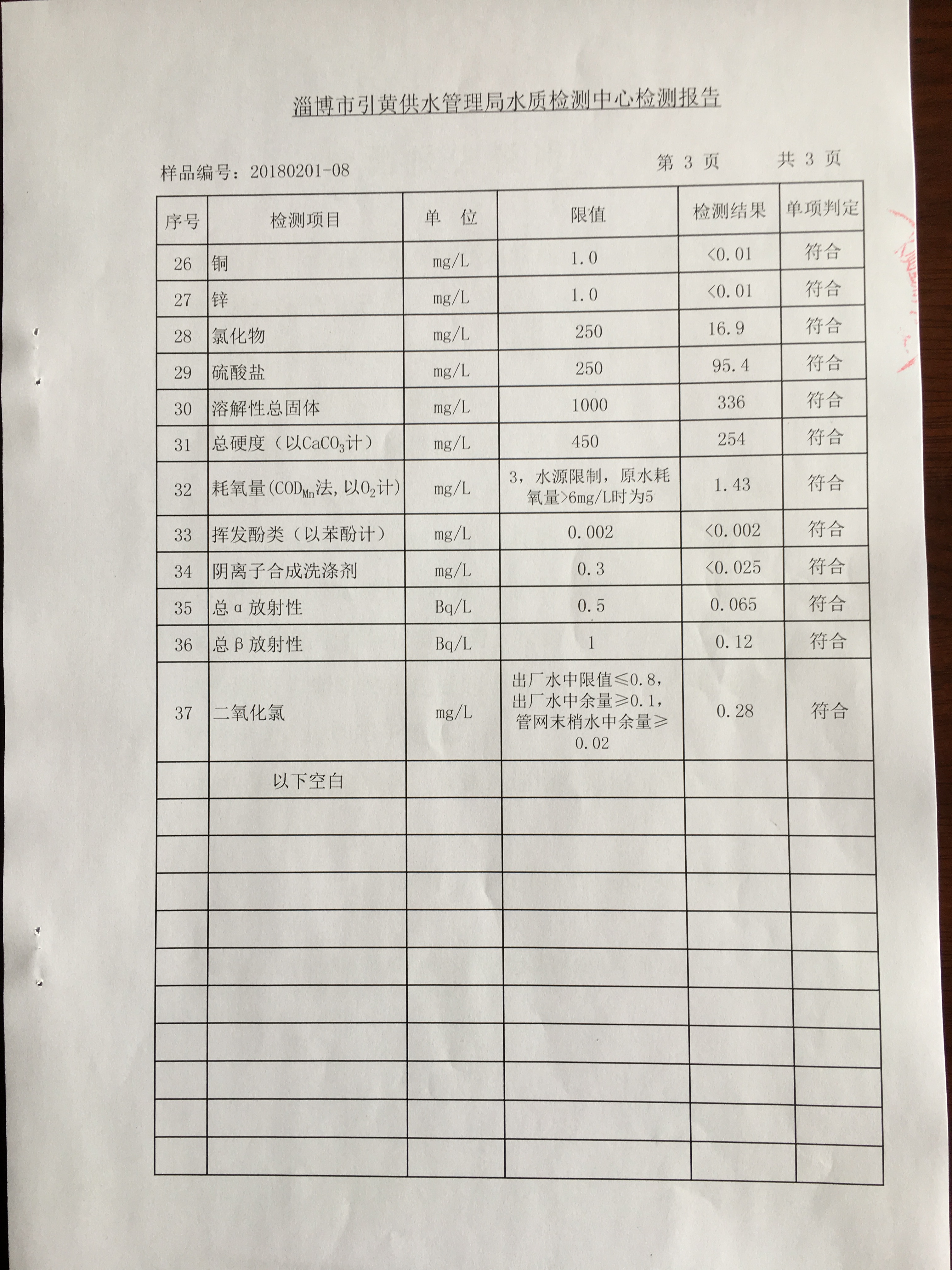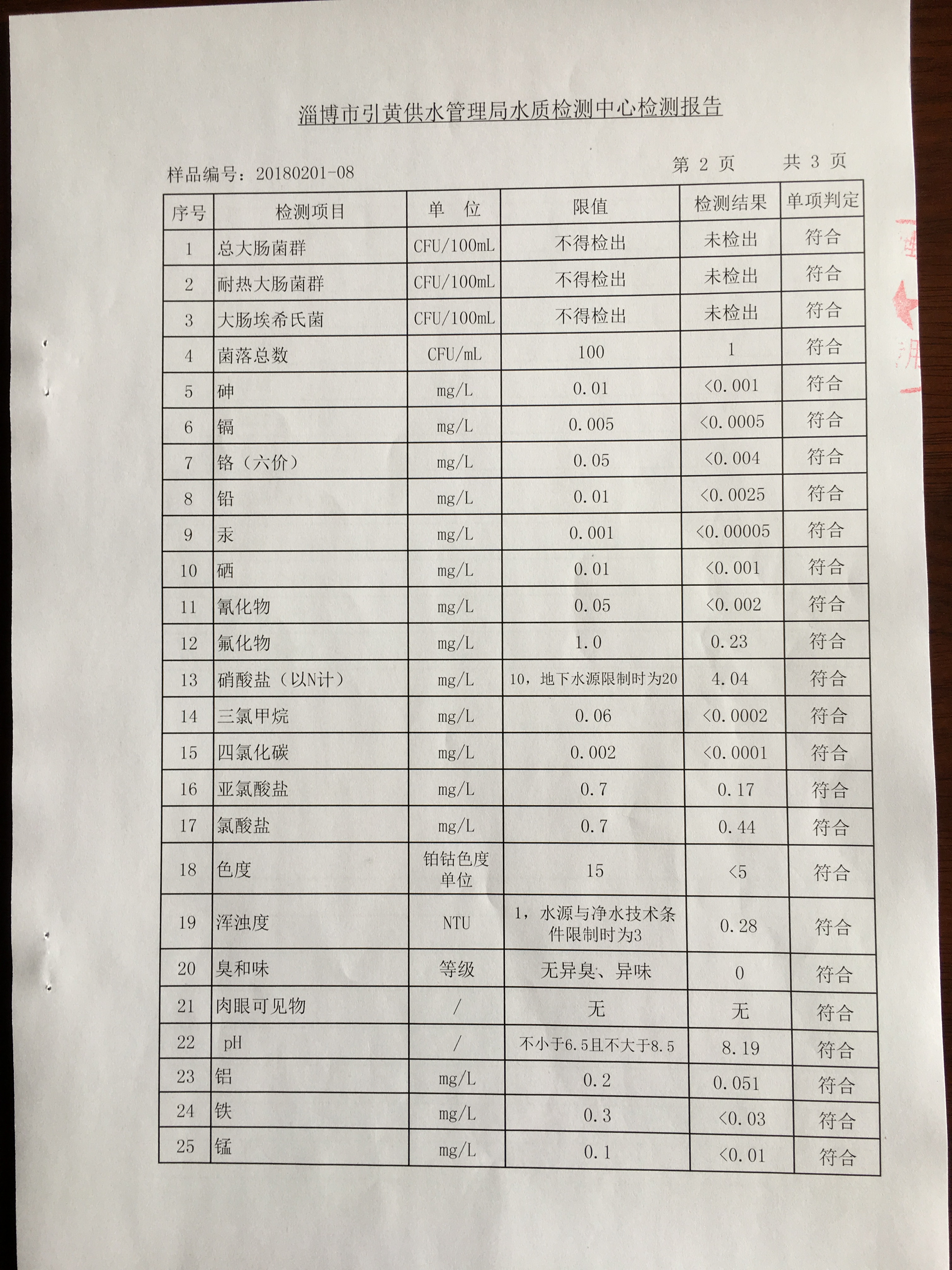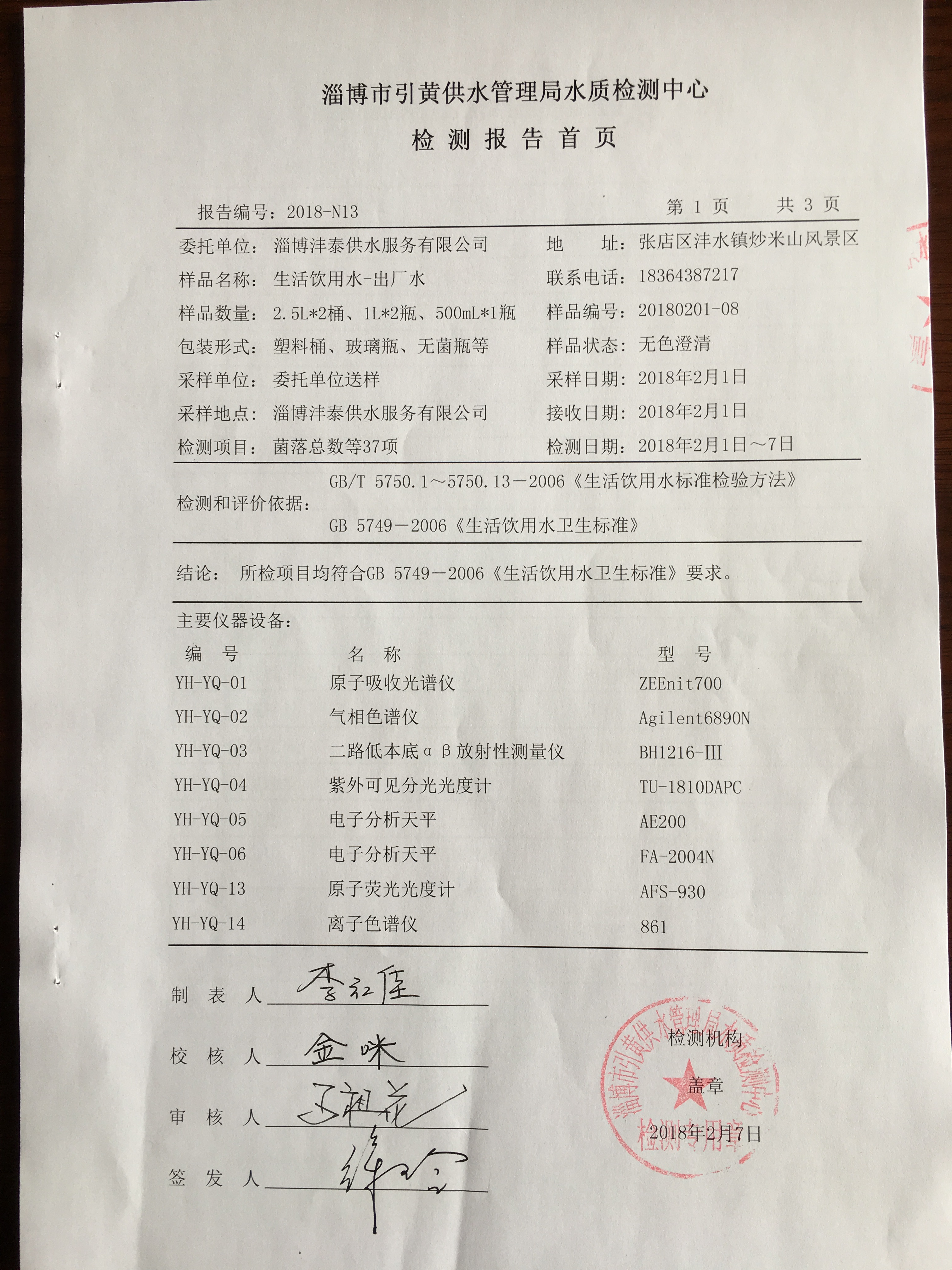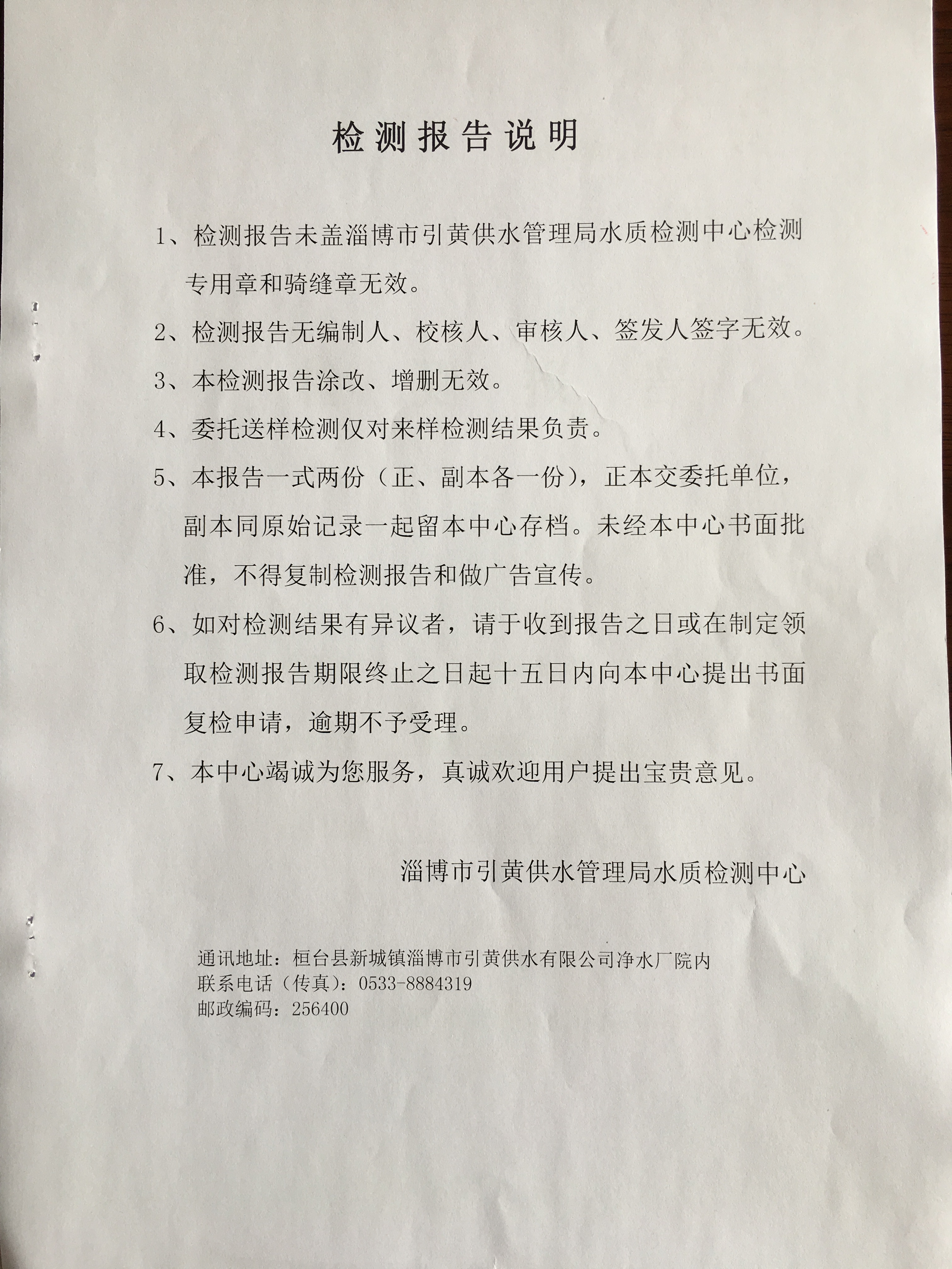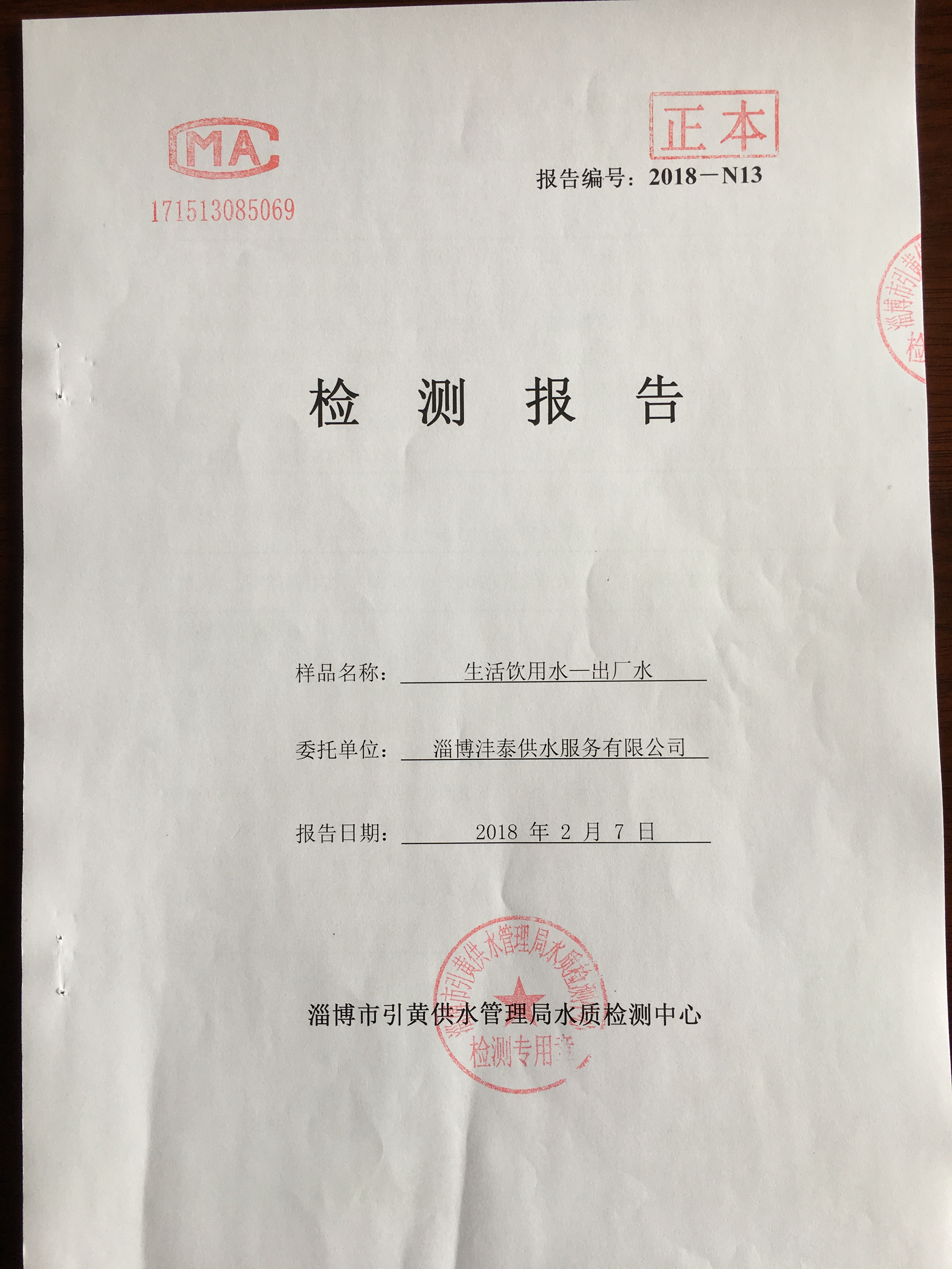 淄博沣泰供水服务有限公司出厂水检测月报表
