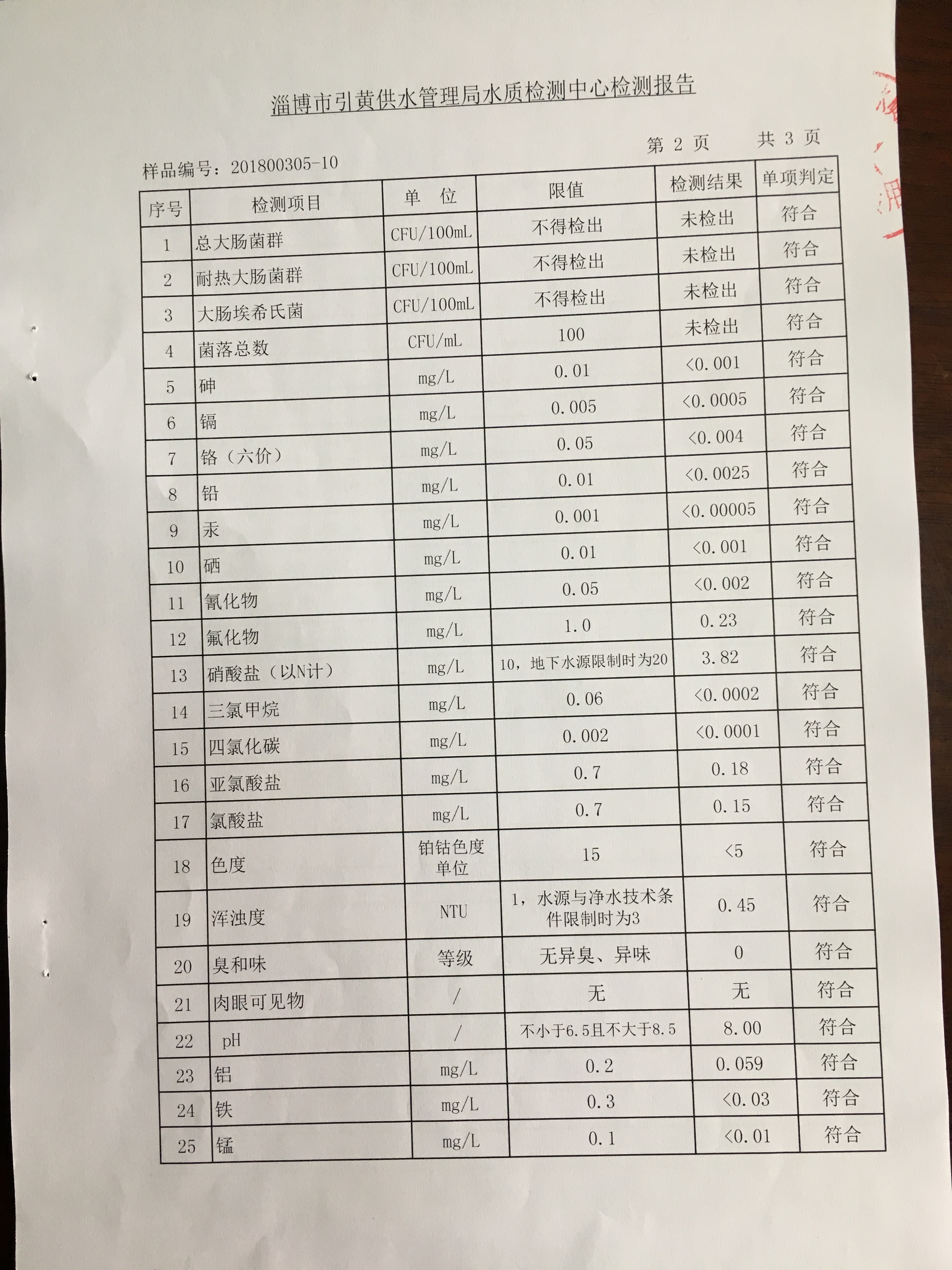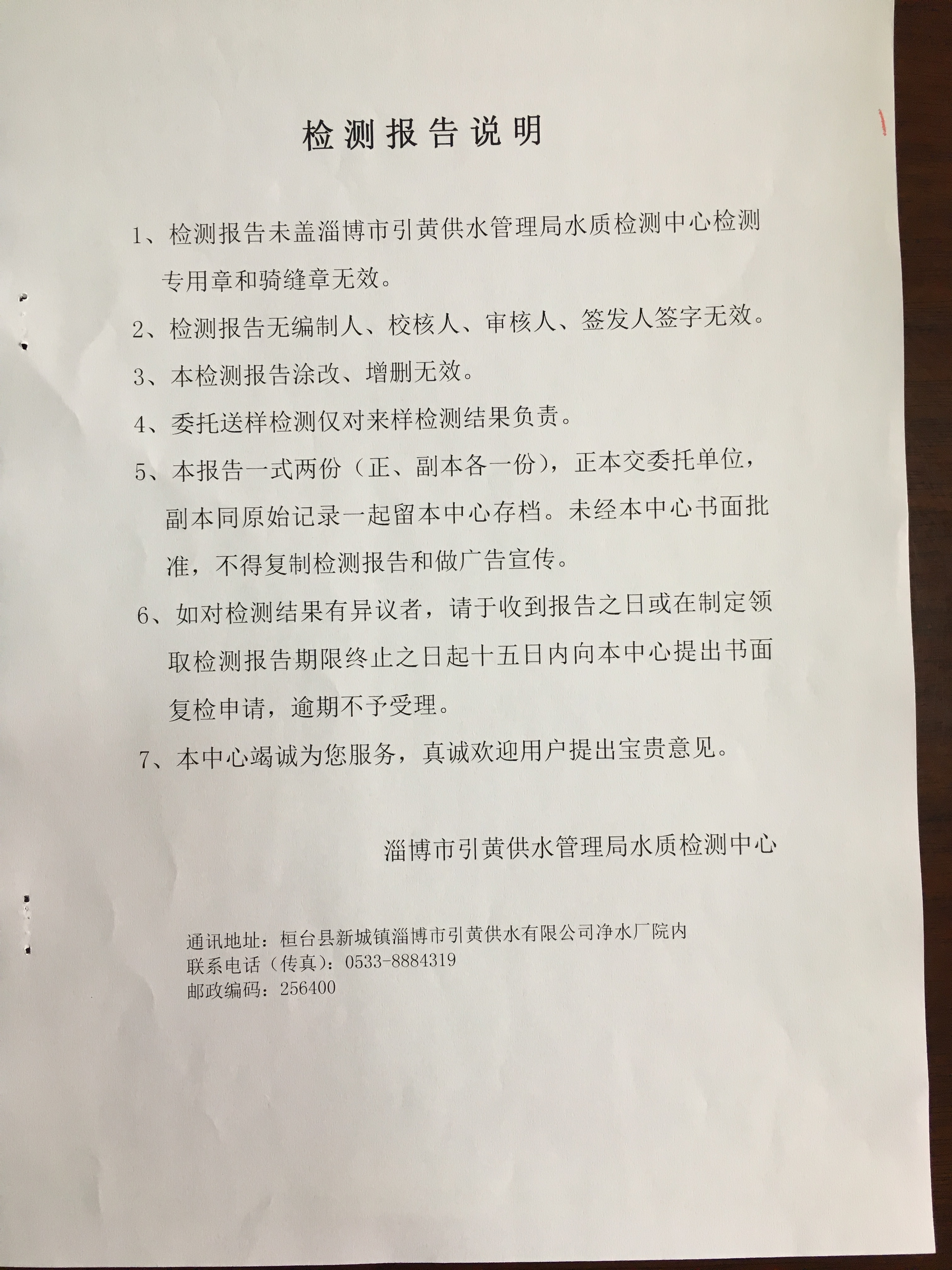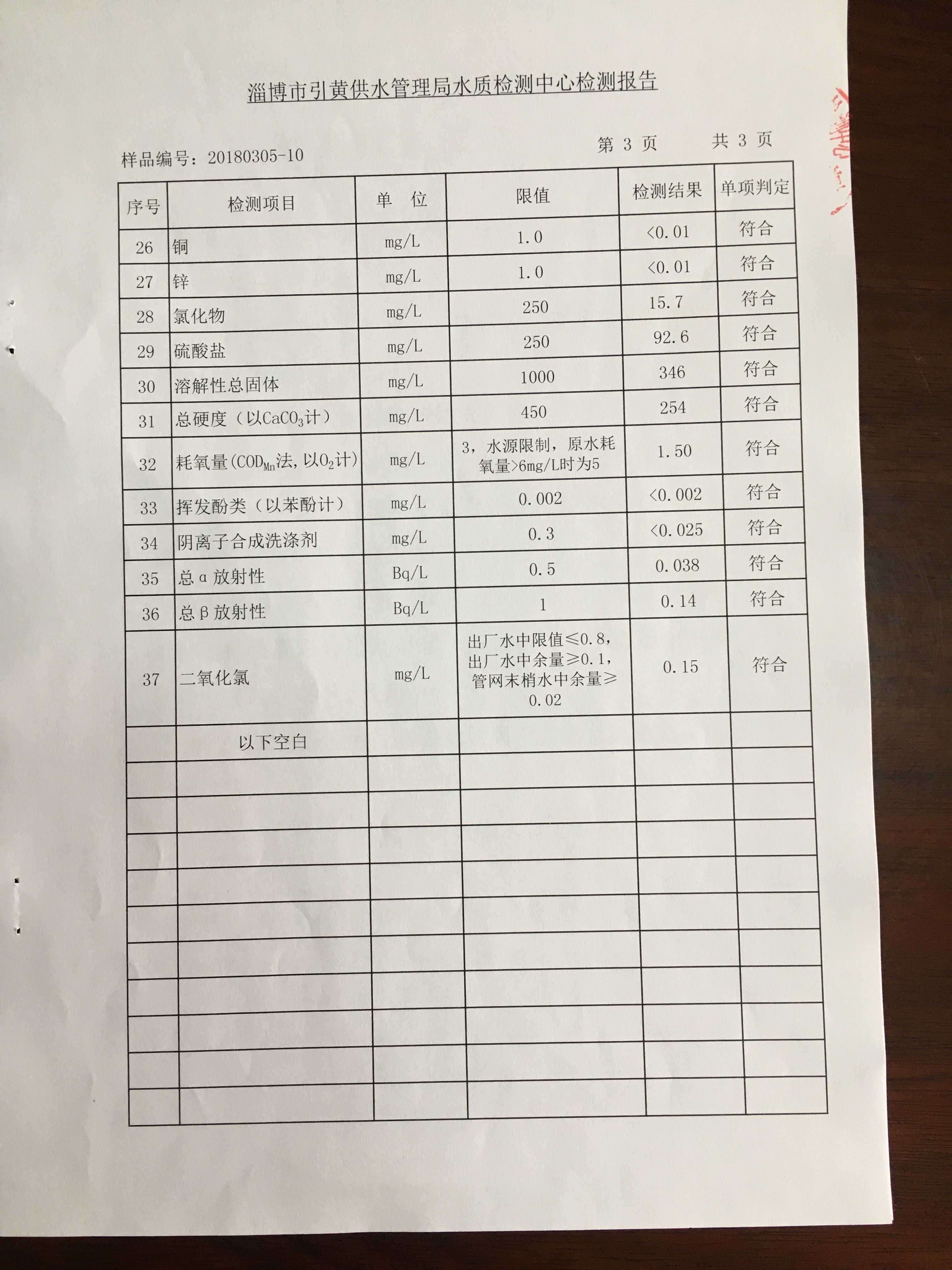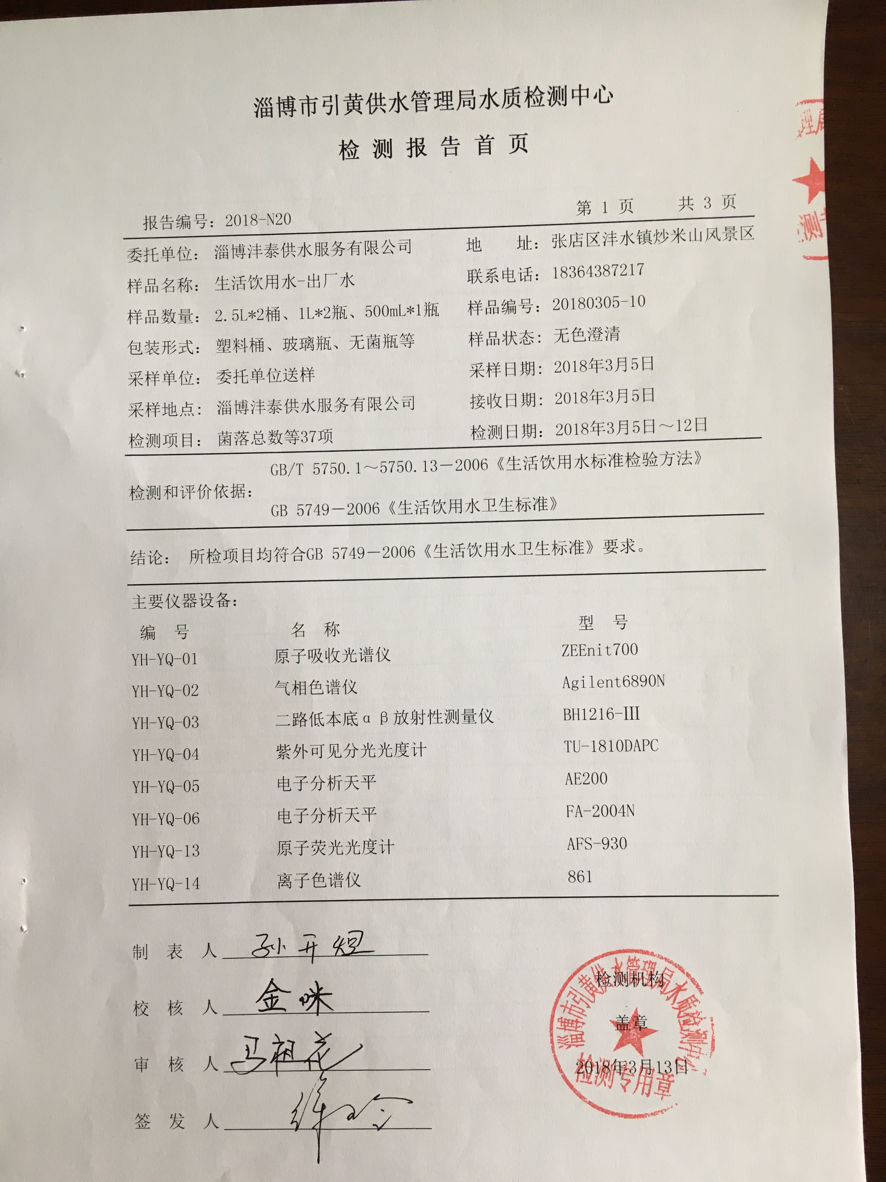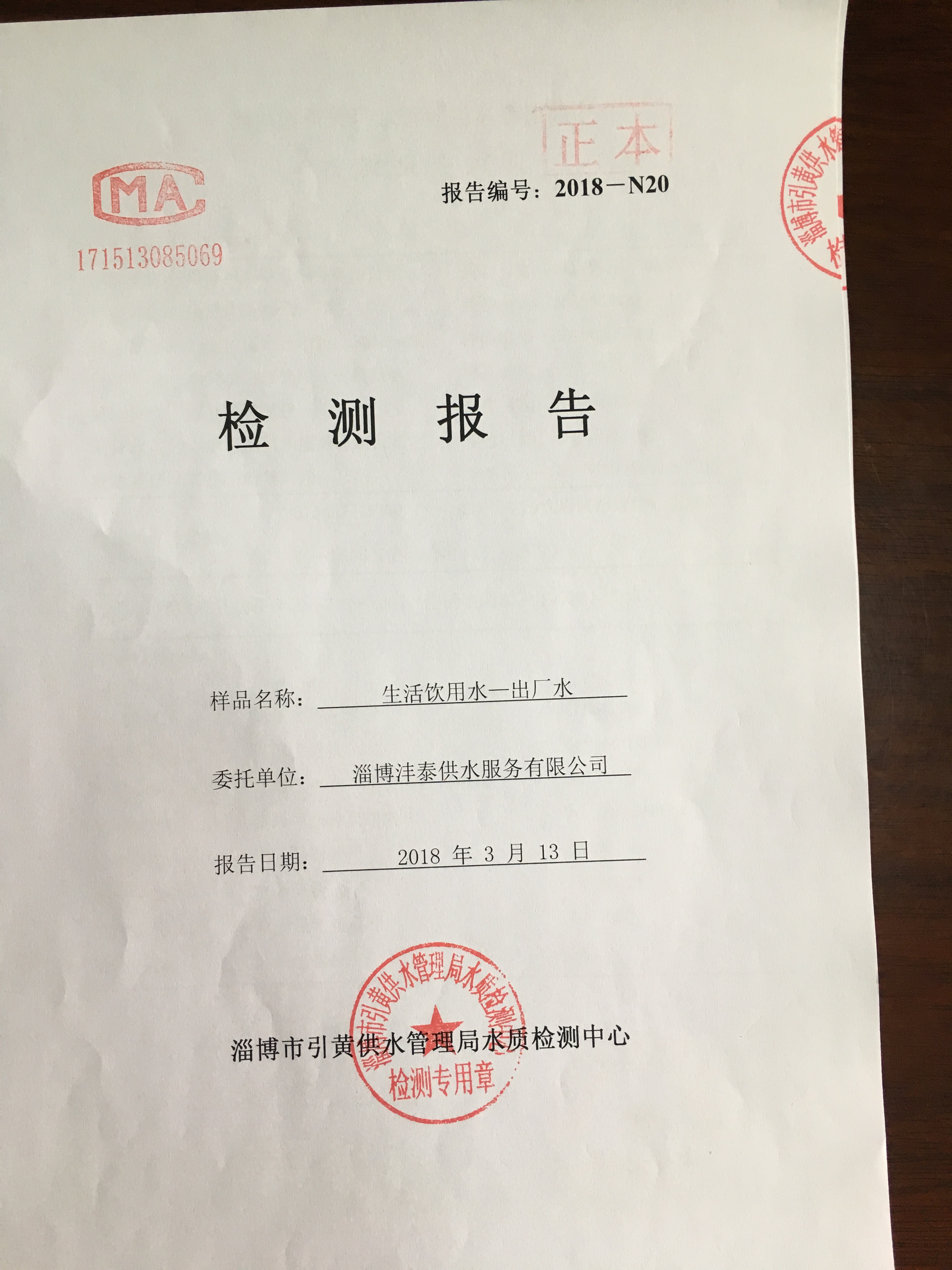 淄博沣泰供水服务有限公司出厂水检测月报表