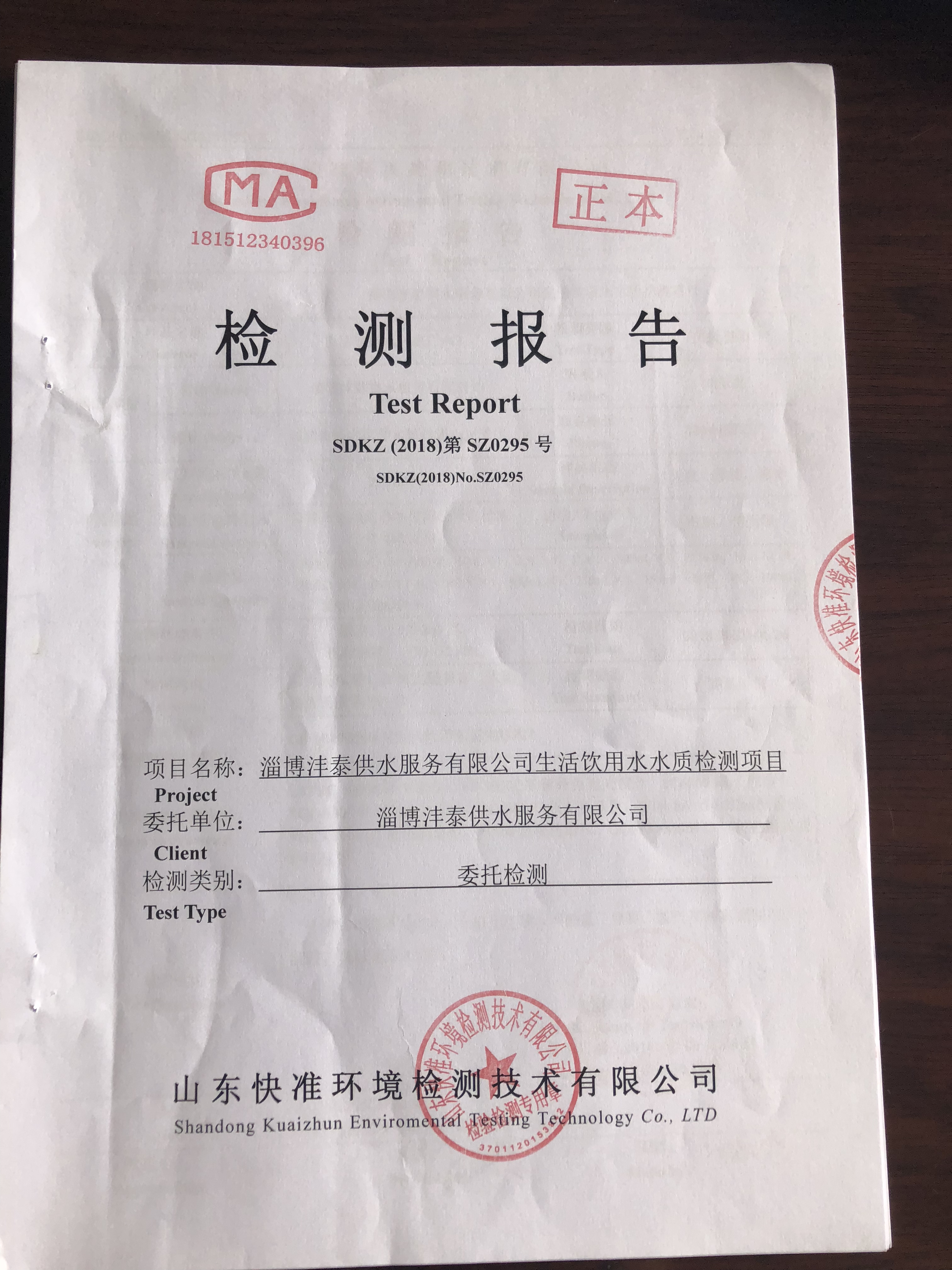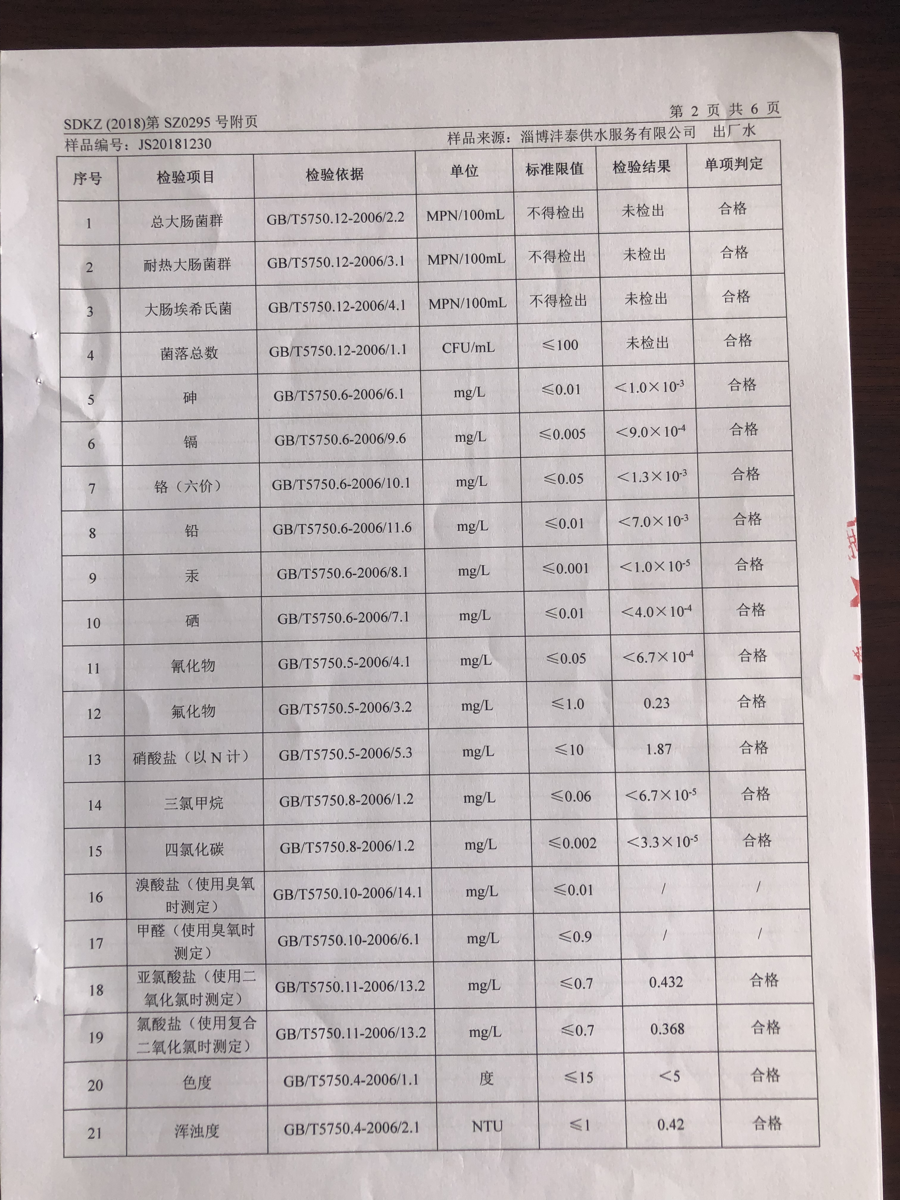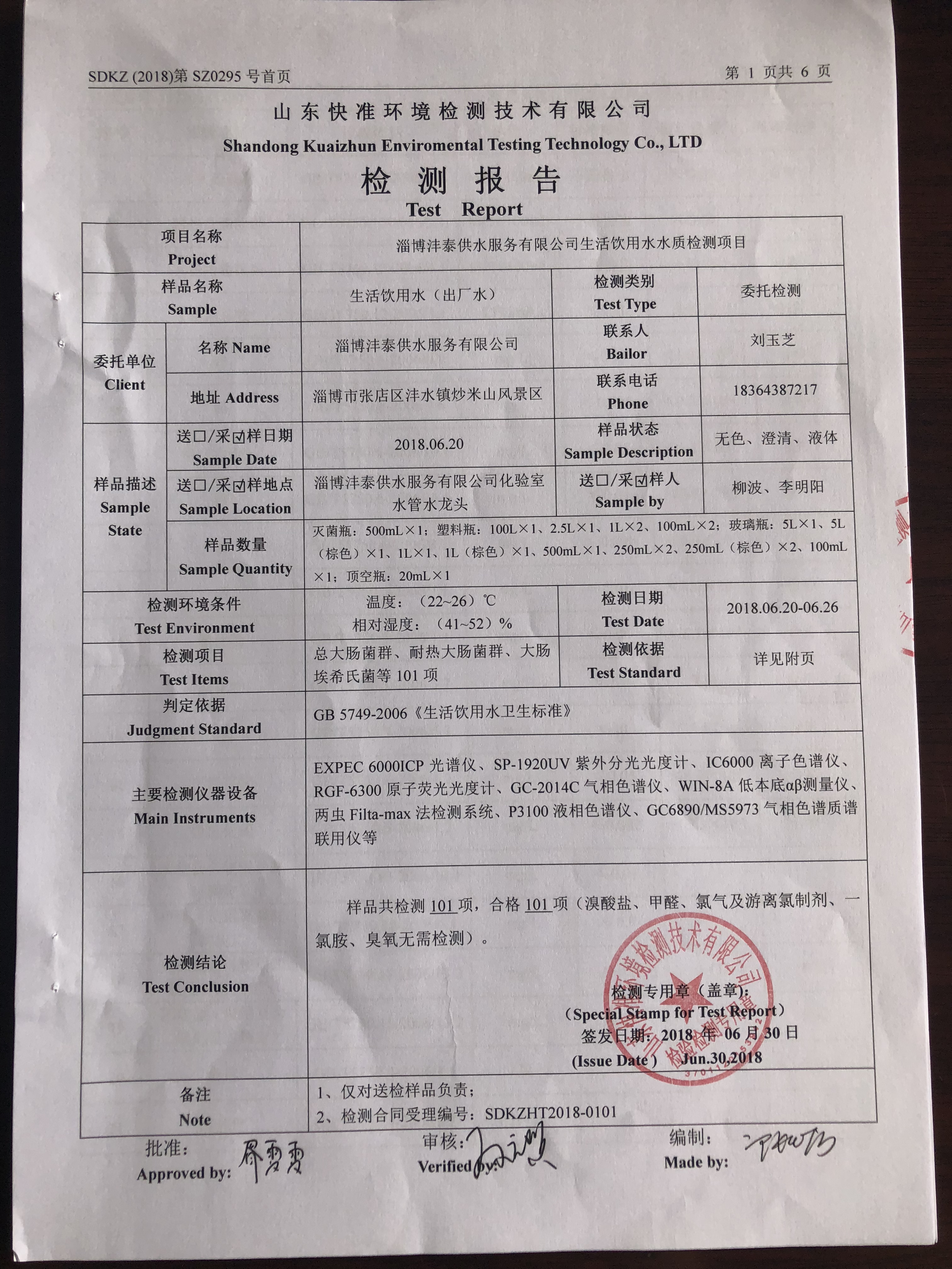 淄博沣泰供水服务有限公司出厂水检测月报表