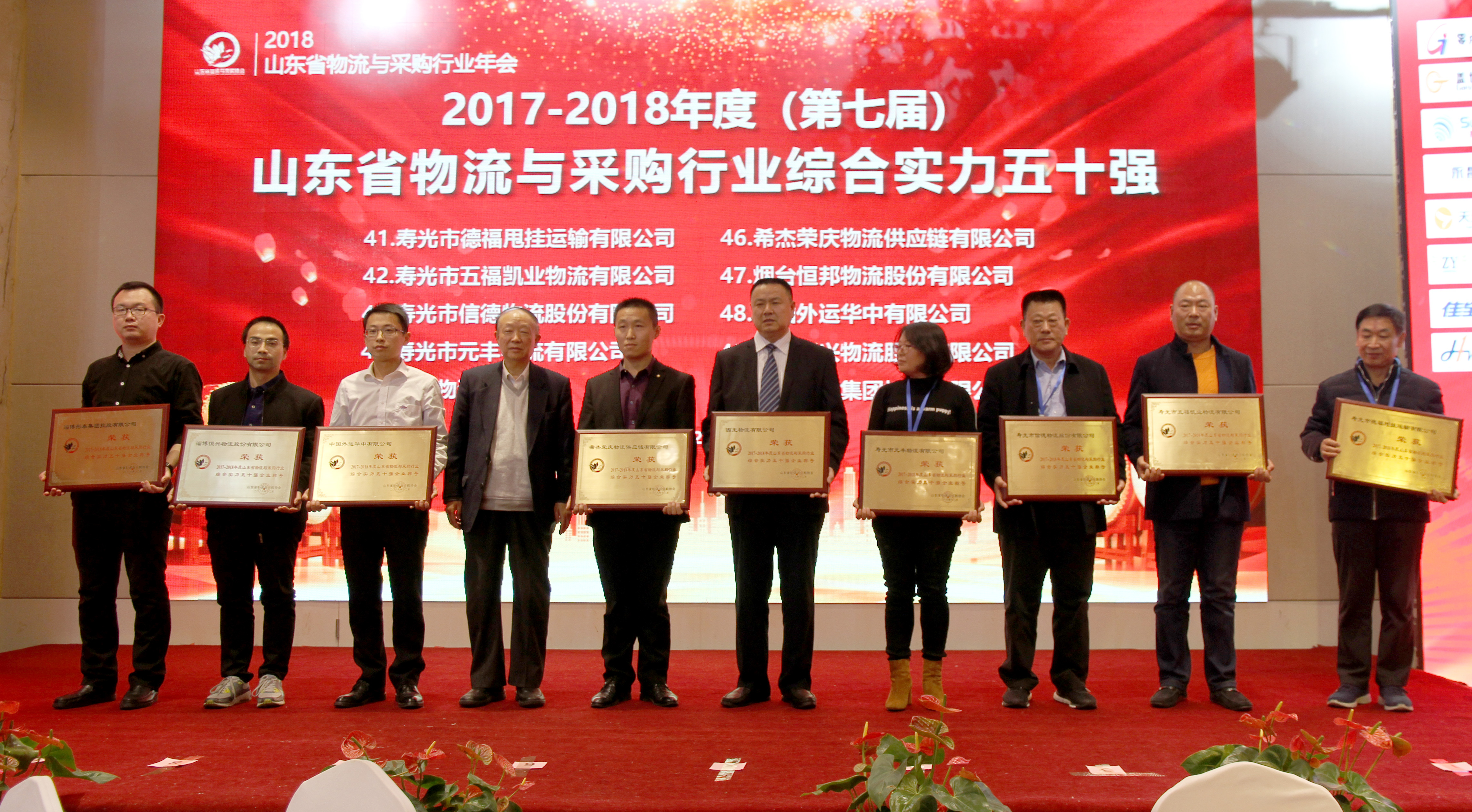 年会公布了“山东省物流与采购行业综合实力50强企业”“山东省冷链物流30强企业”“2018山东物流界年度人物“获奖名单,并予以颁奖授牌。我公司荣获“2017-2018年度山东省物流与采购行业综合实力50强企业荣誉称号”,集团公司董事长段连峰荣获“改革开放40年山东物流界功勋人物”荣誉称号。我公司并作为特邀嘉宾参加了《2018年度山东省物流园区发展报告》发布会。