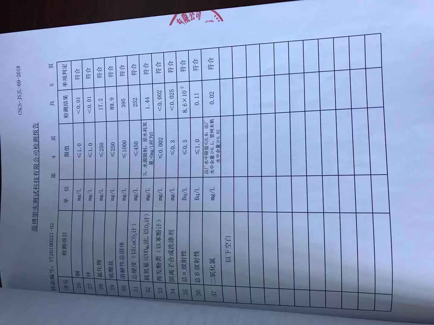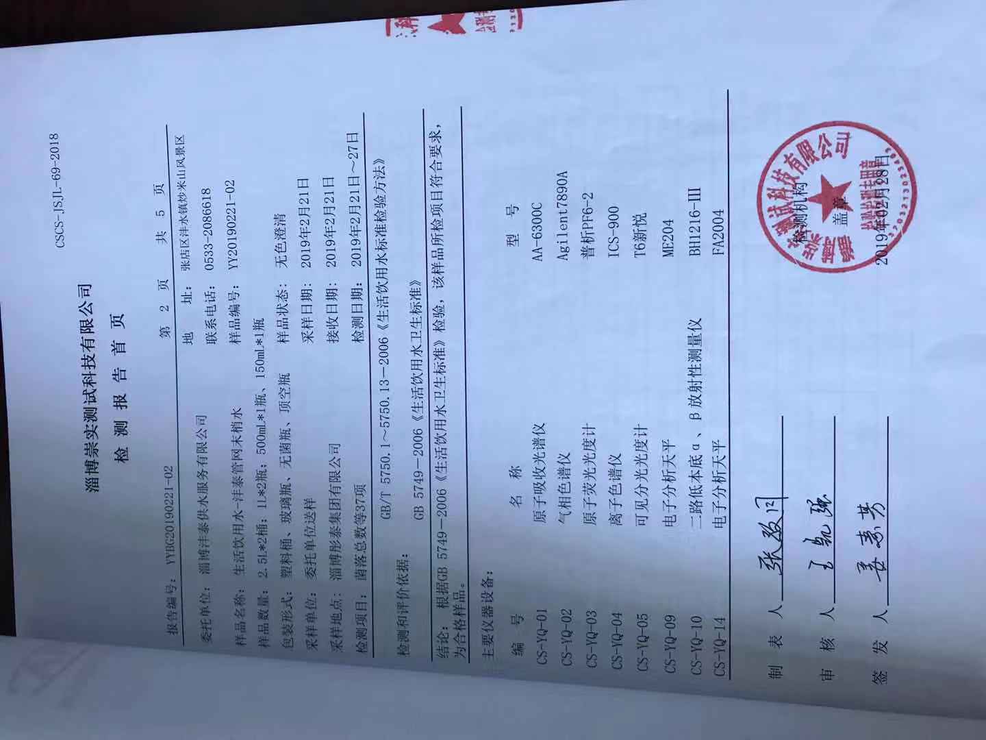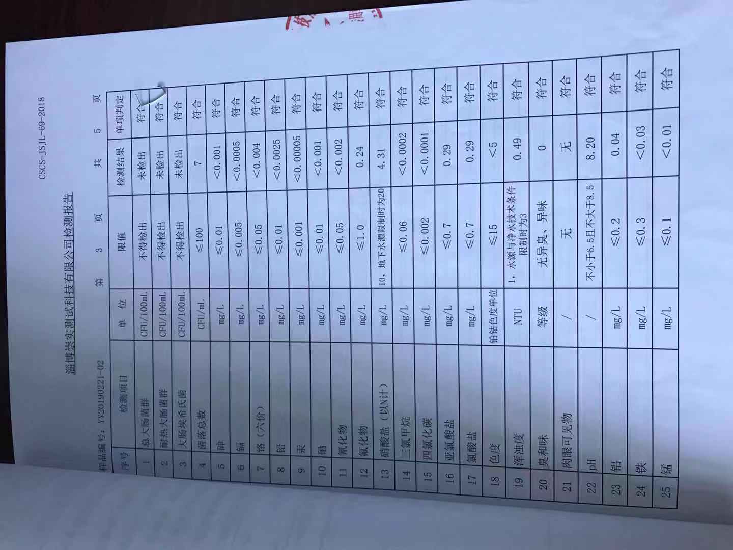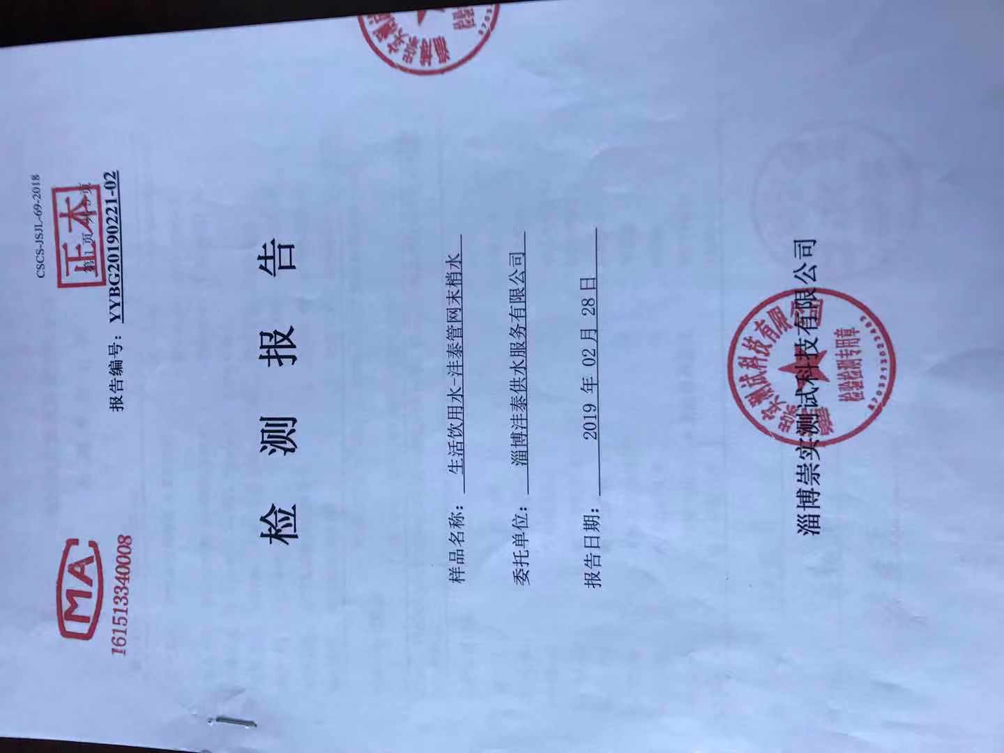 淄博沣泰供水服务有限公司末梢水月报表