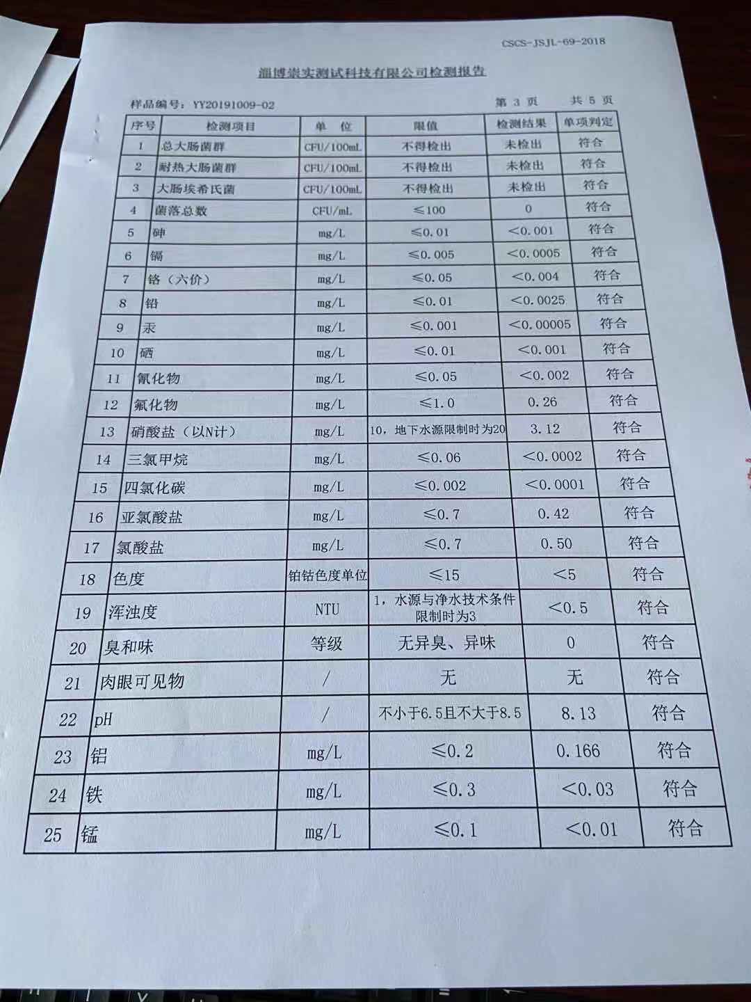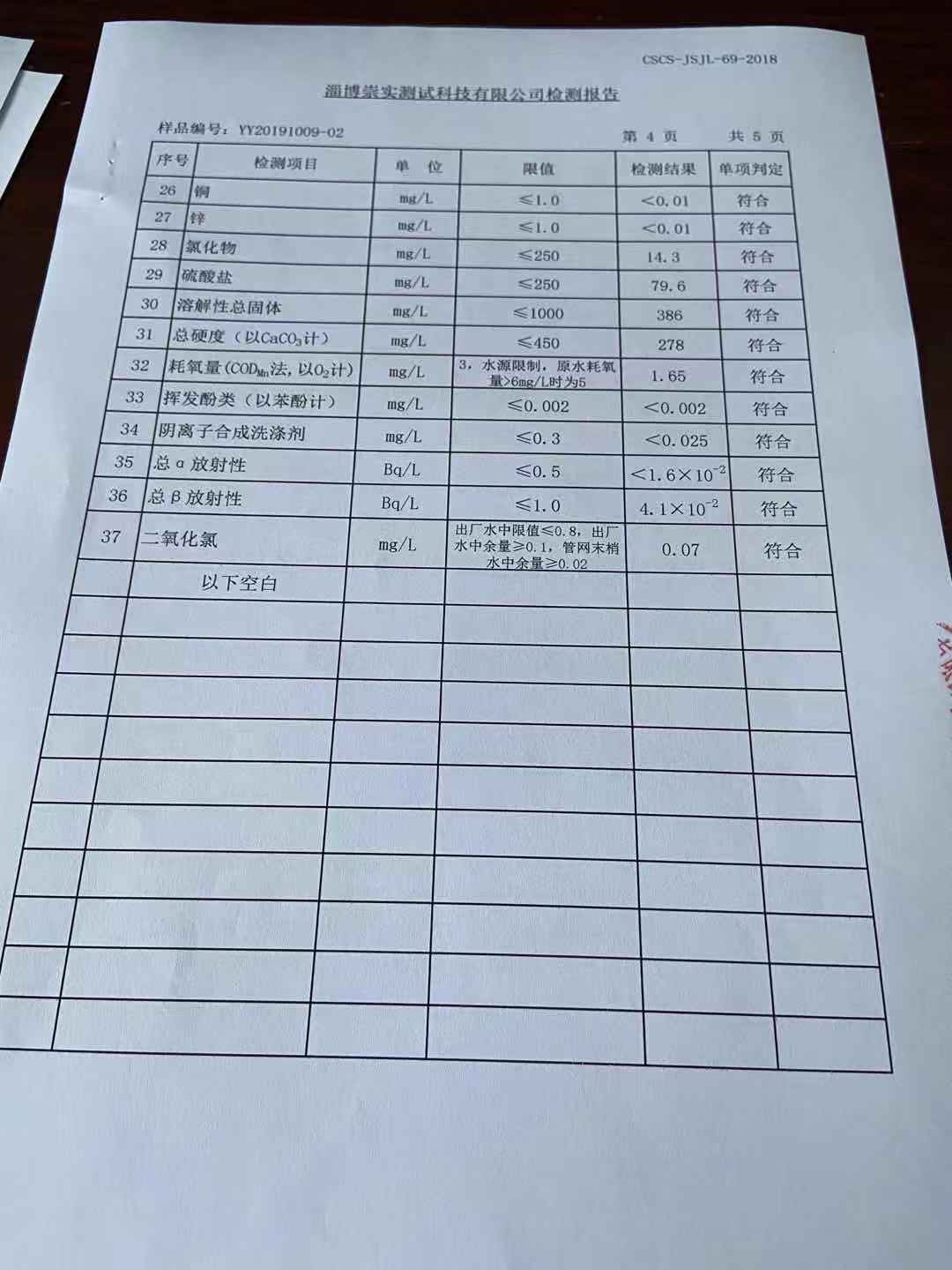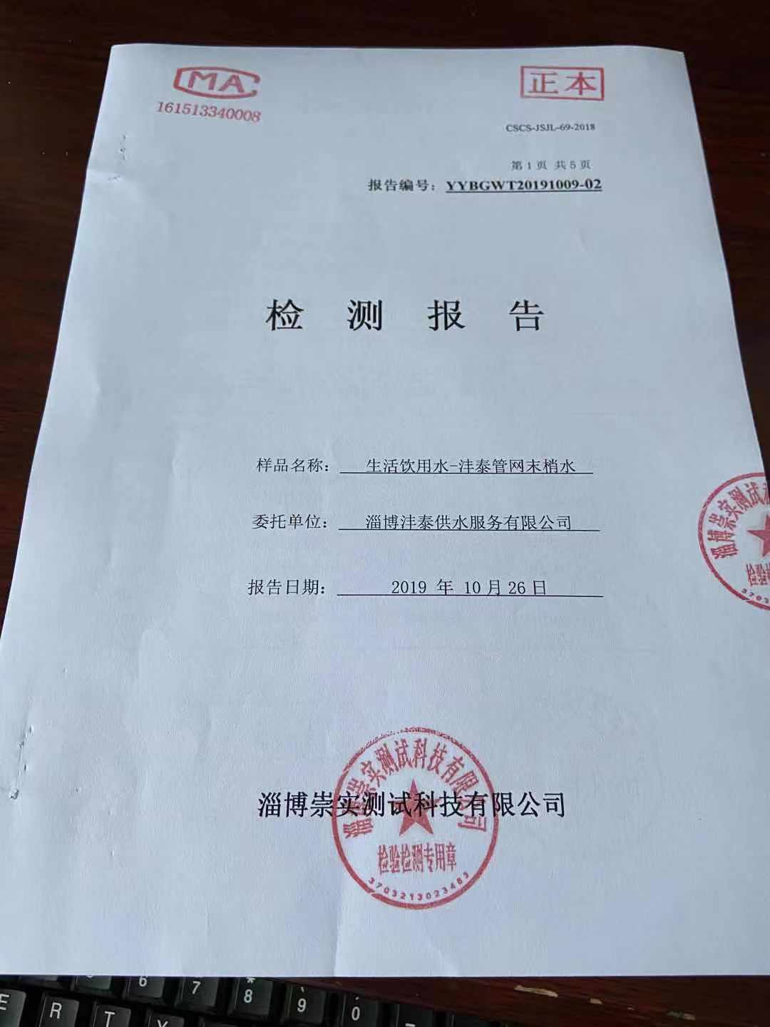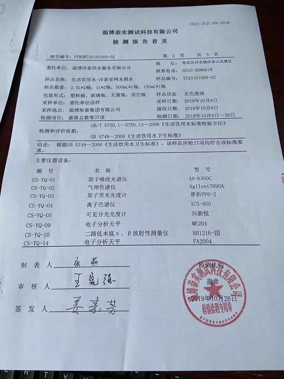 淄博沣泰供水服务有限公司末梢水月报表