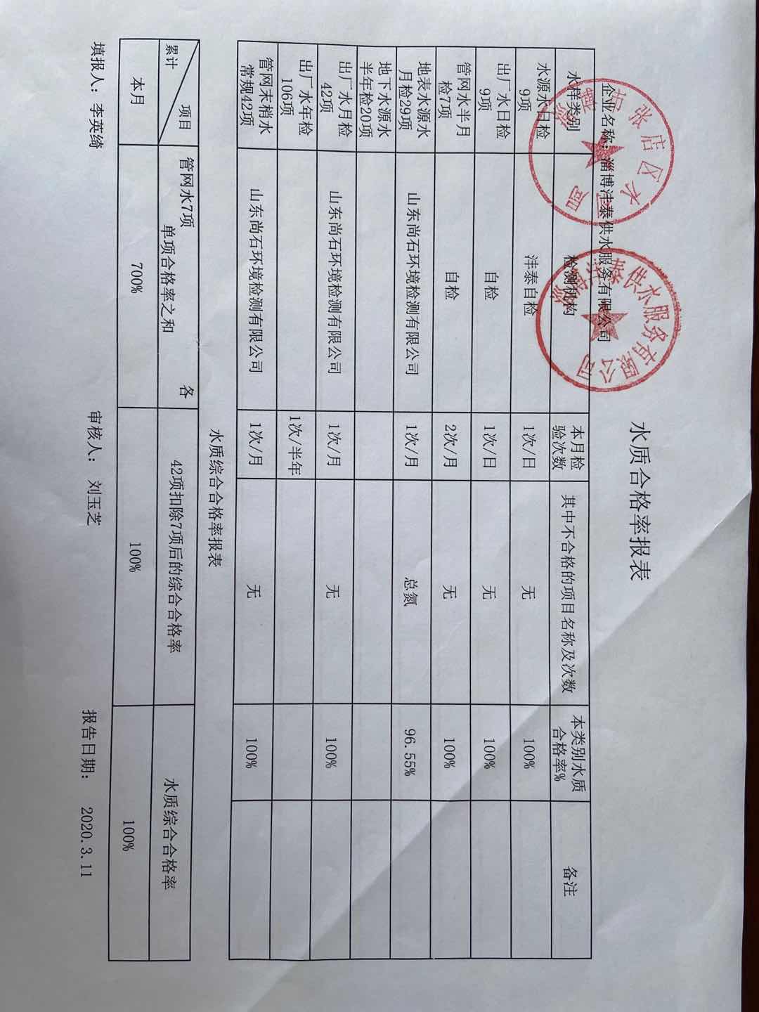淄博沣泰供水服务有限公司水质合格率报表