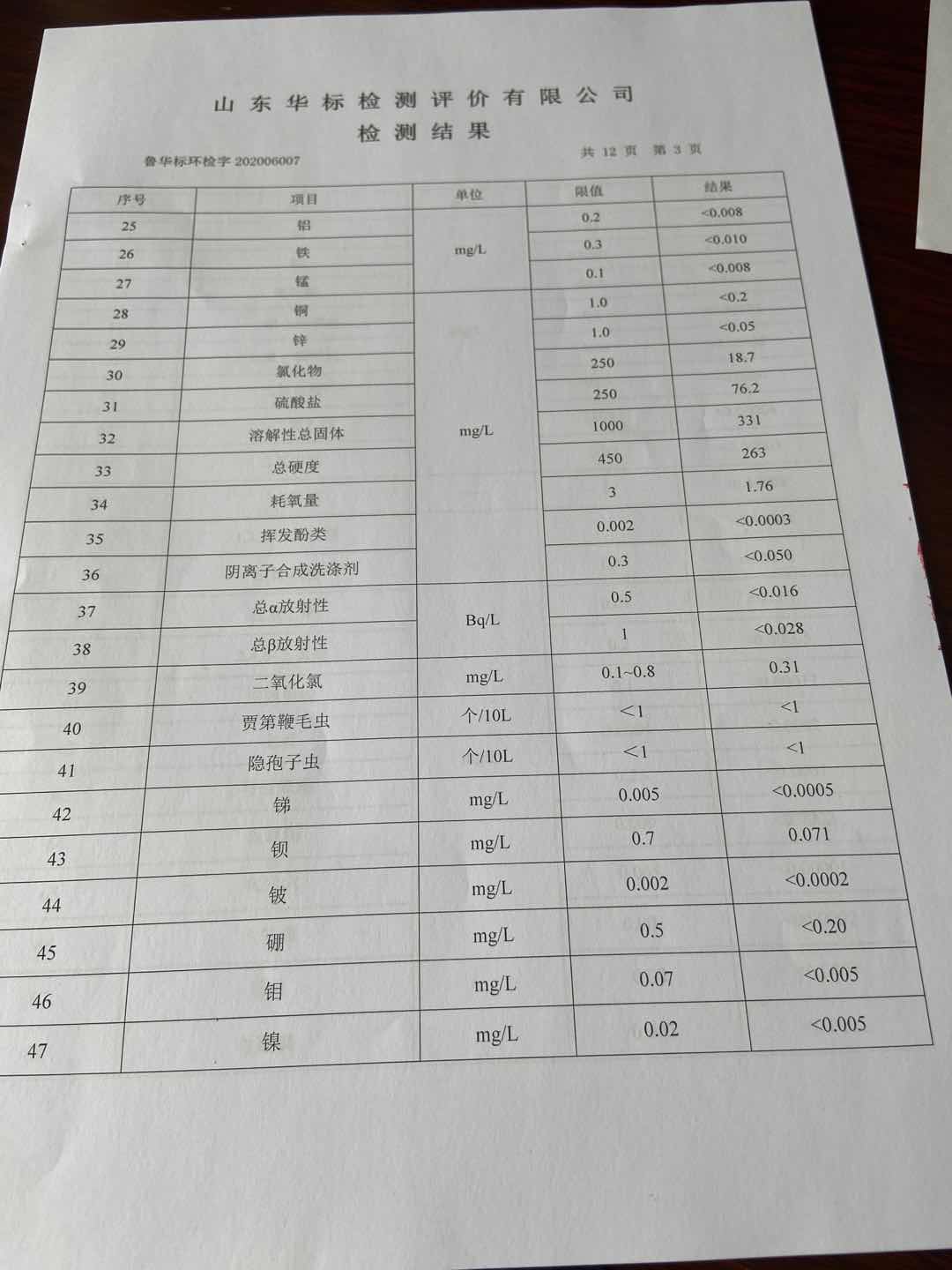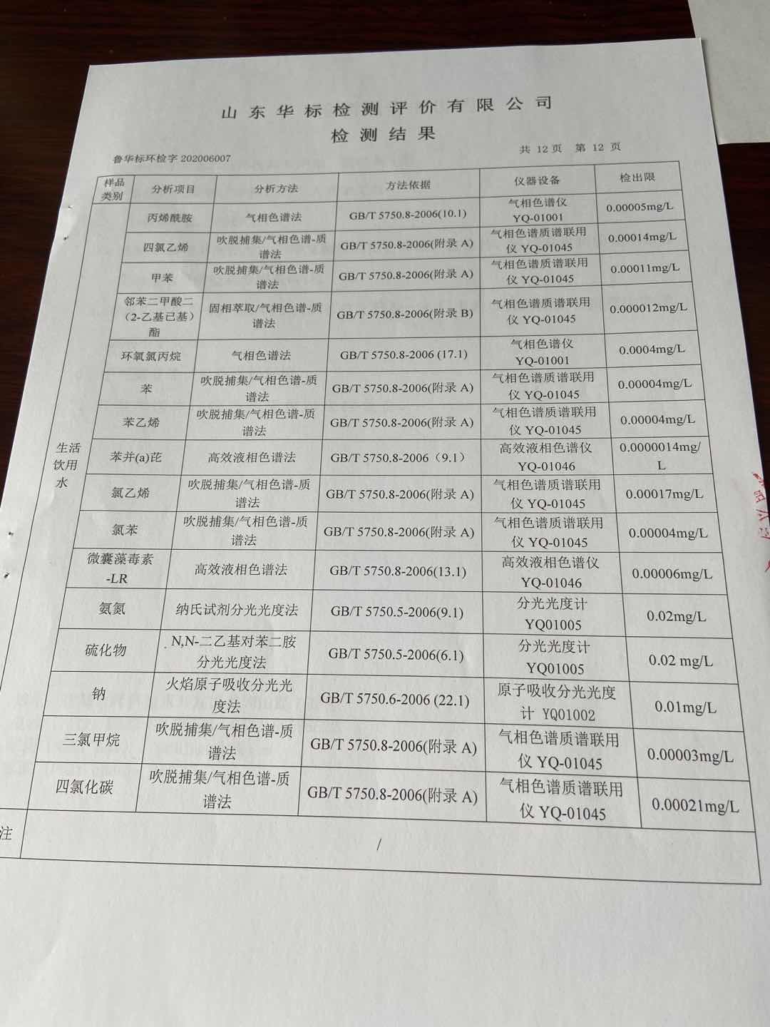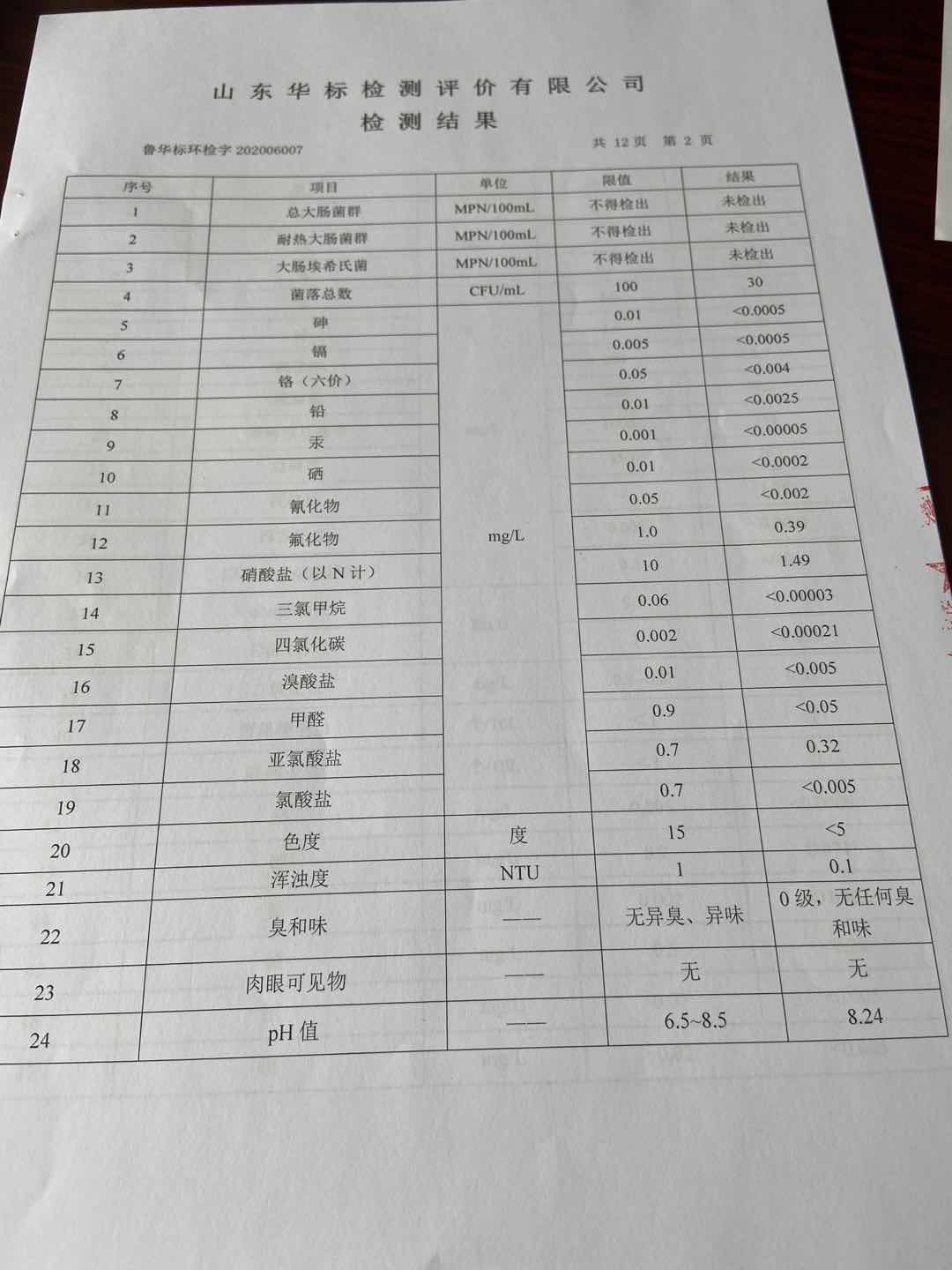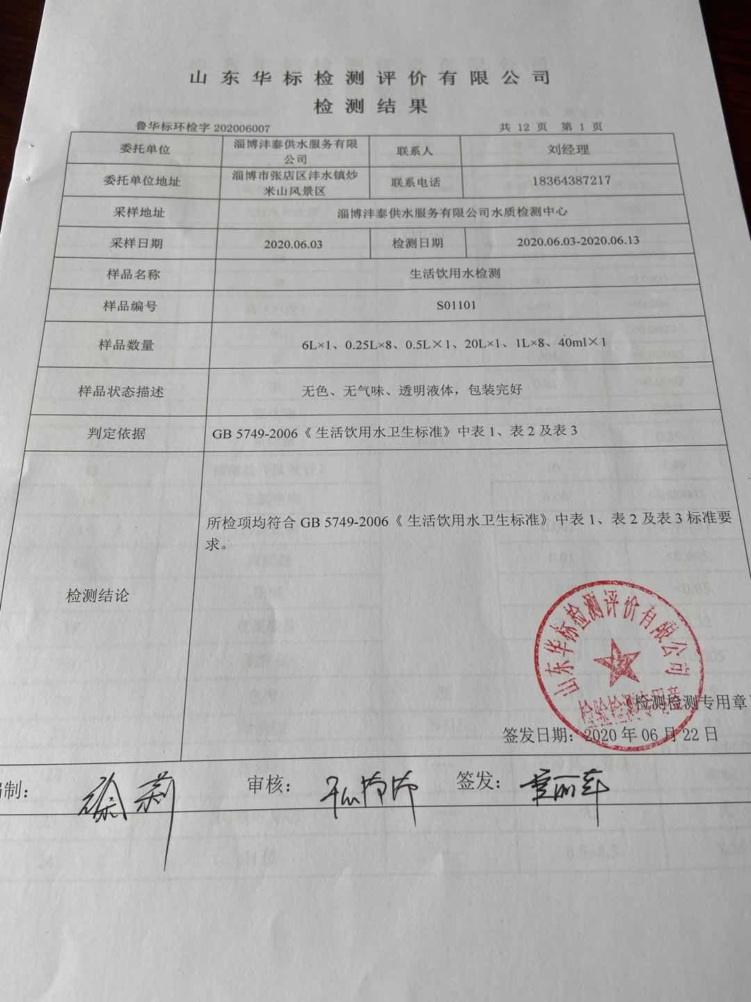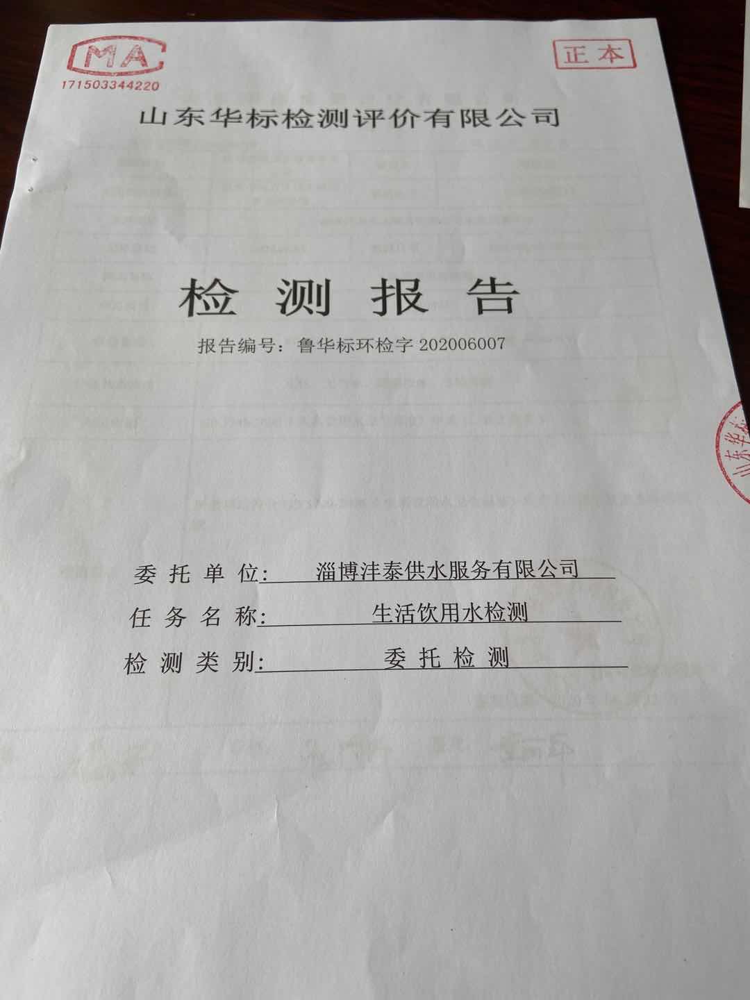 淄博沣泰供水服务有限公司出厂水月检报告