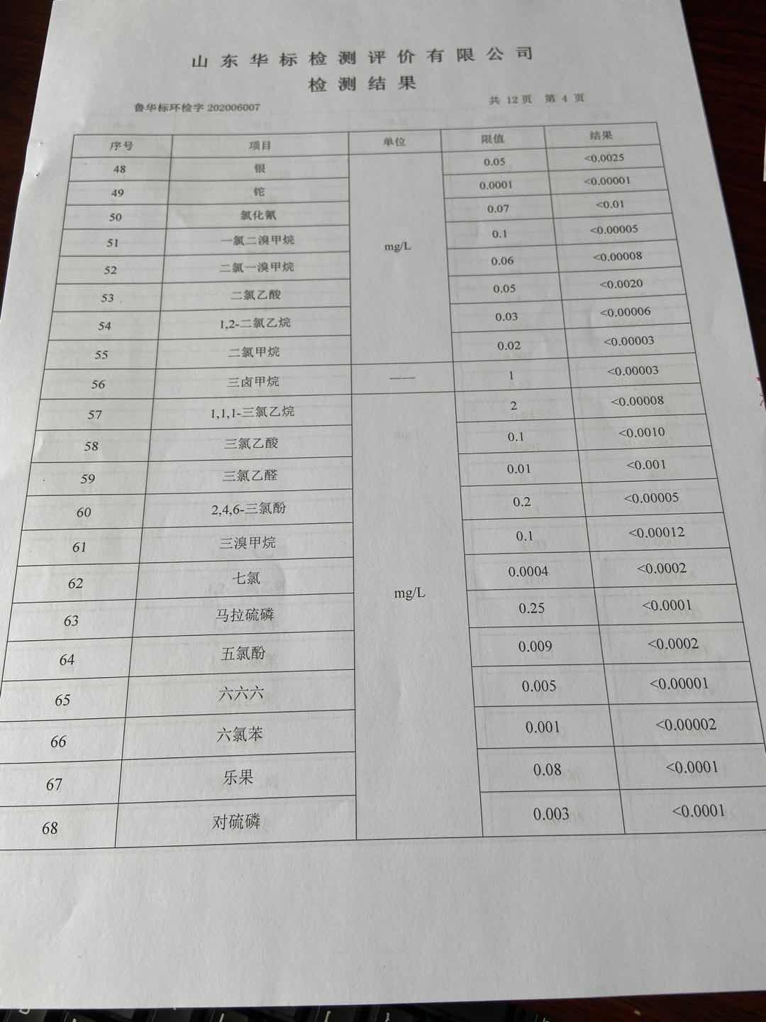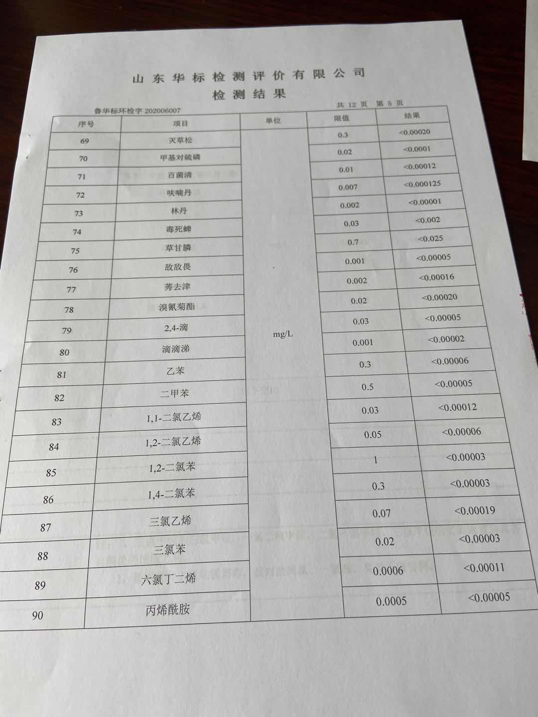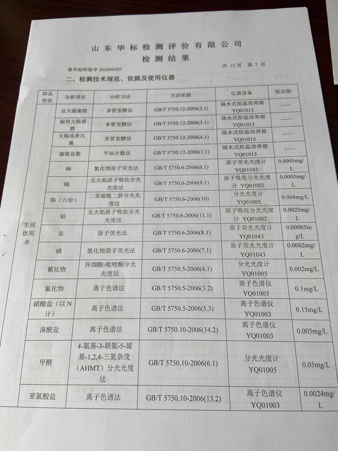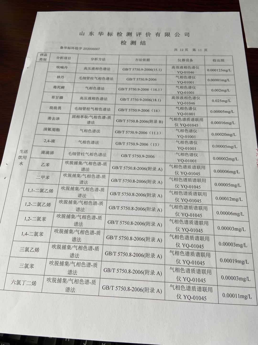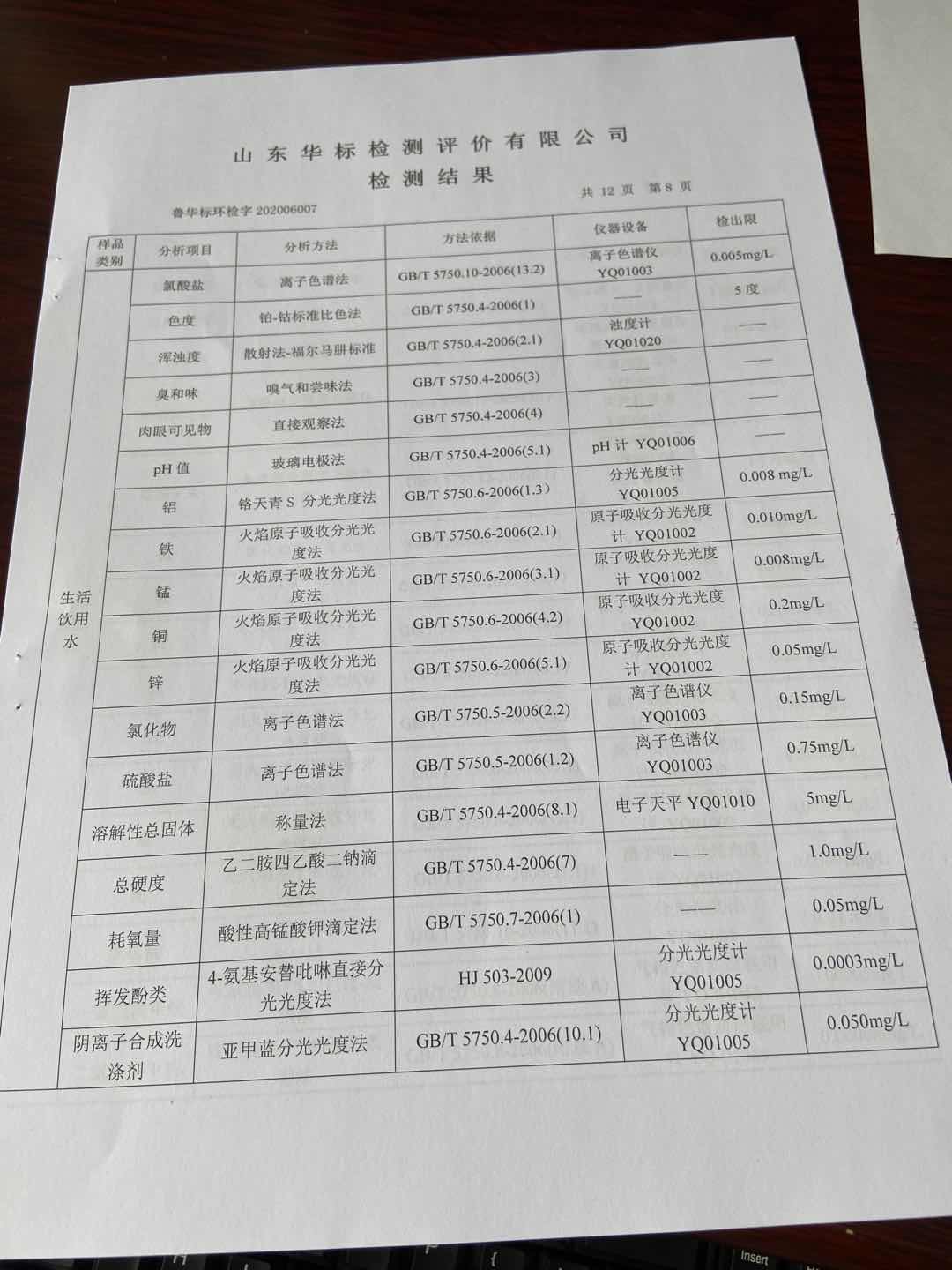 淄博沣泰供水服务有限公司出厂水月检报告