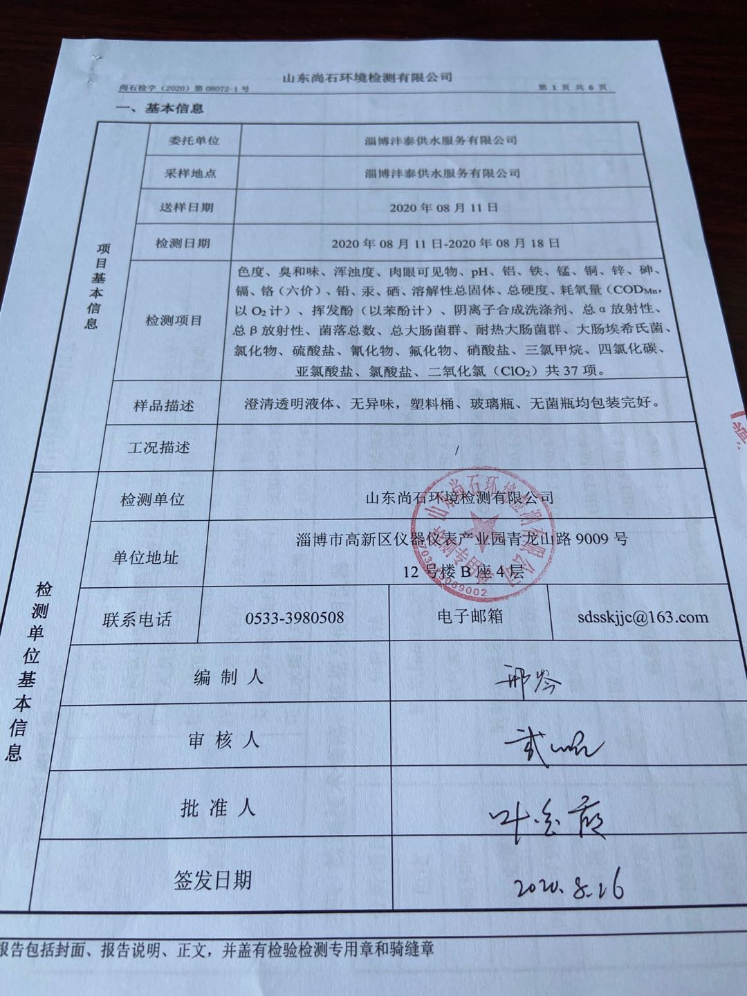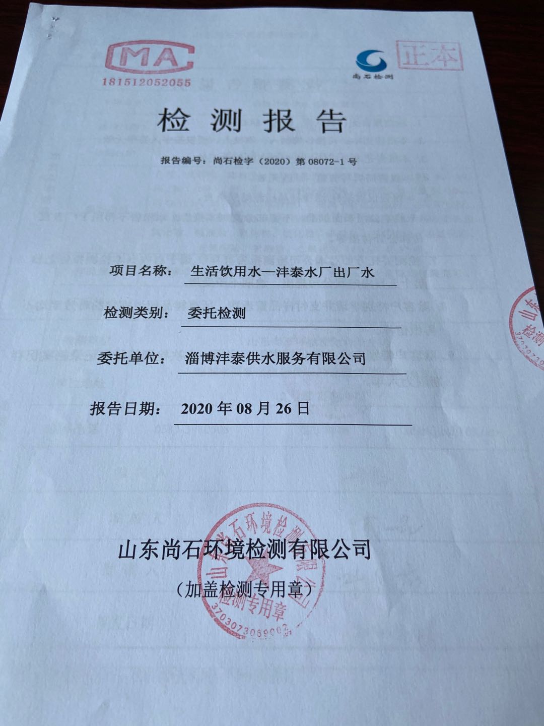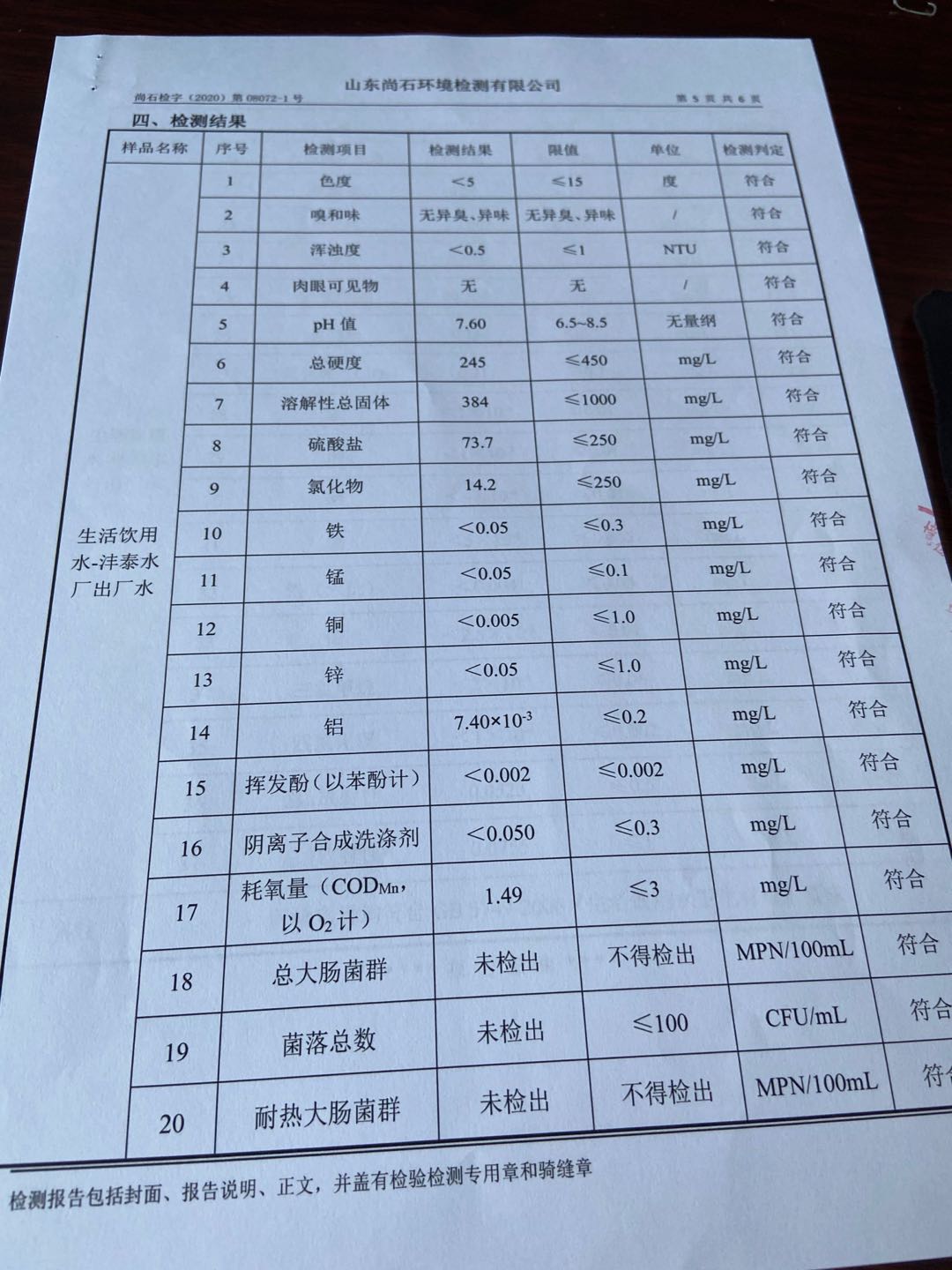 淄博沣泰供水服务有限公司出厂水月检报表