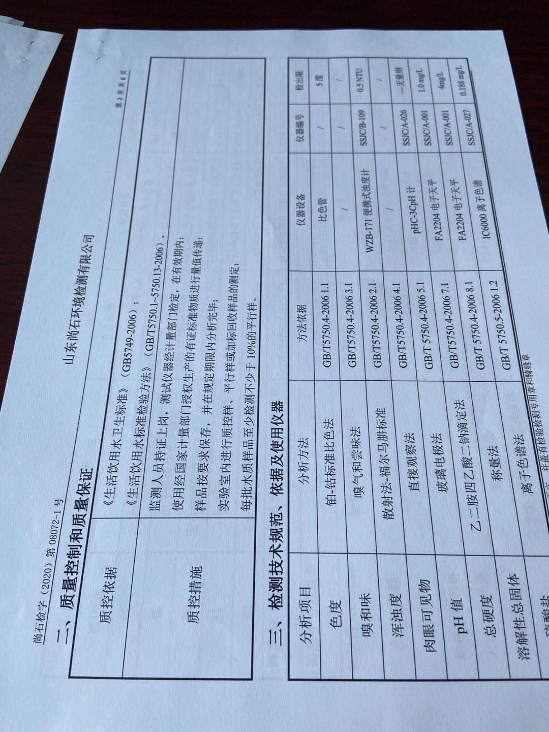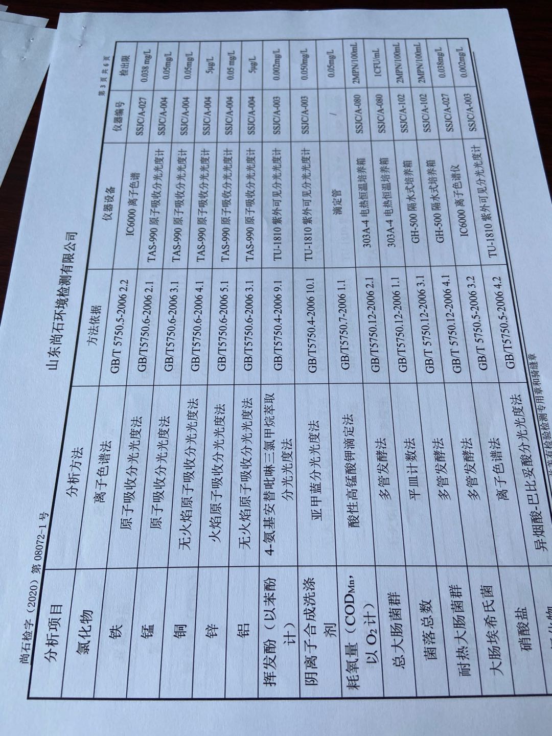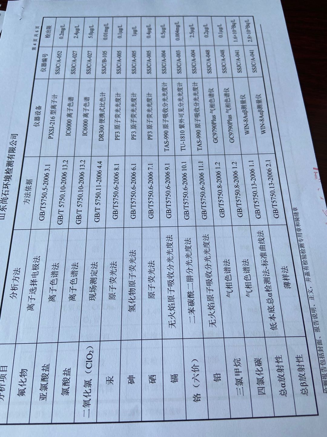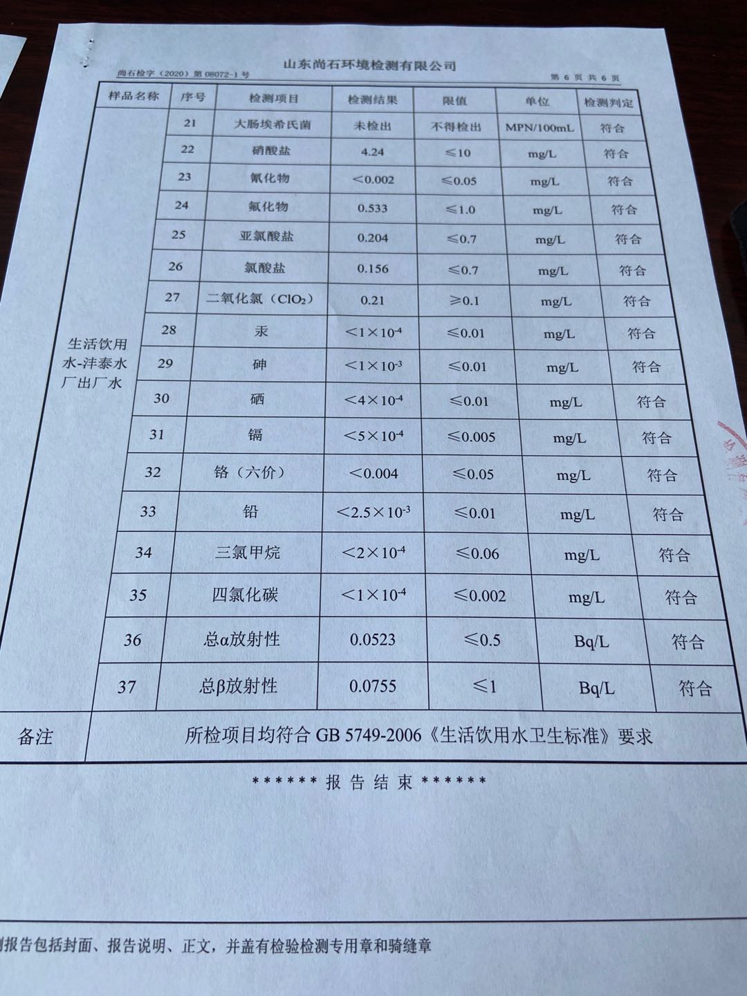 淄博沣泰供水服务有限公司出厂水月检报表