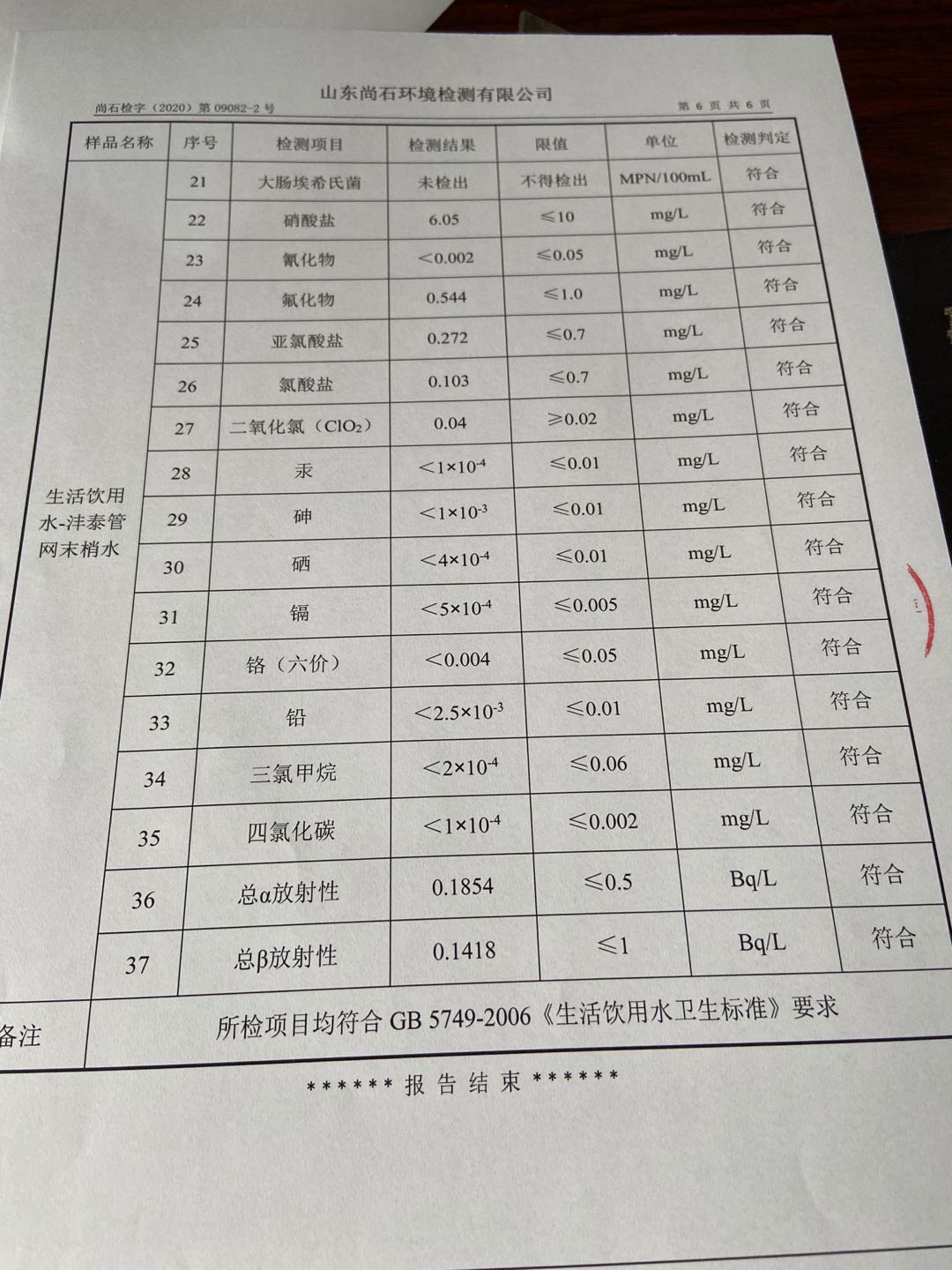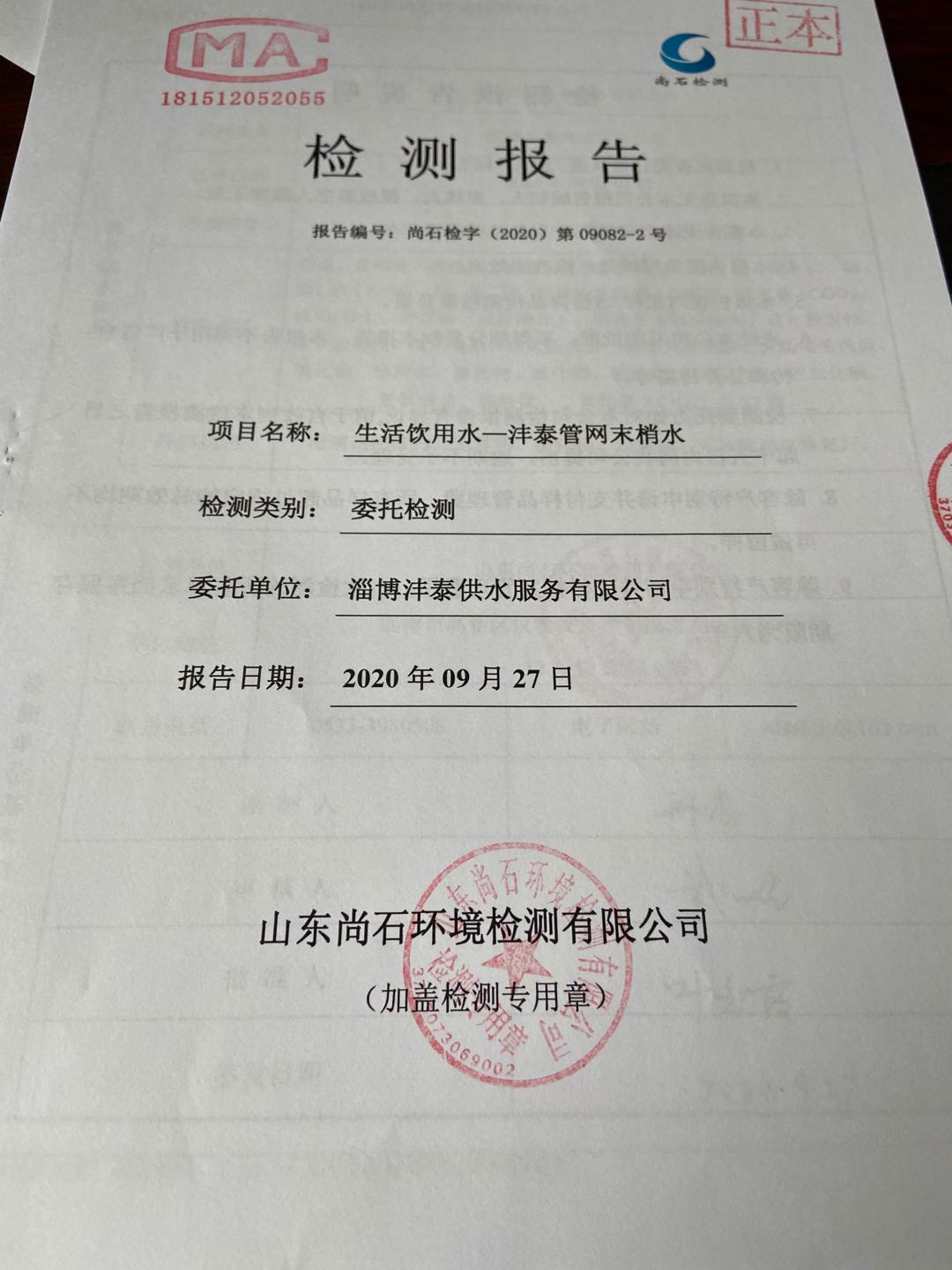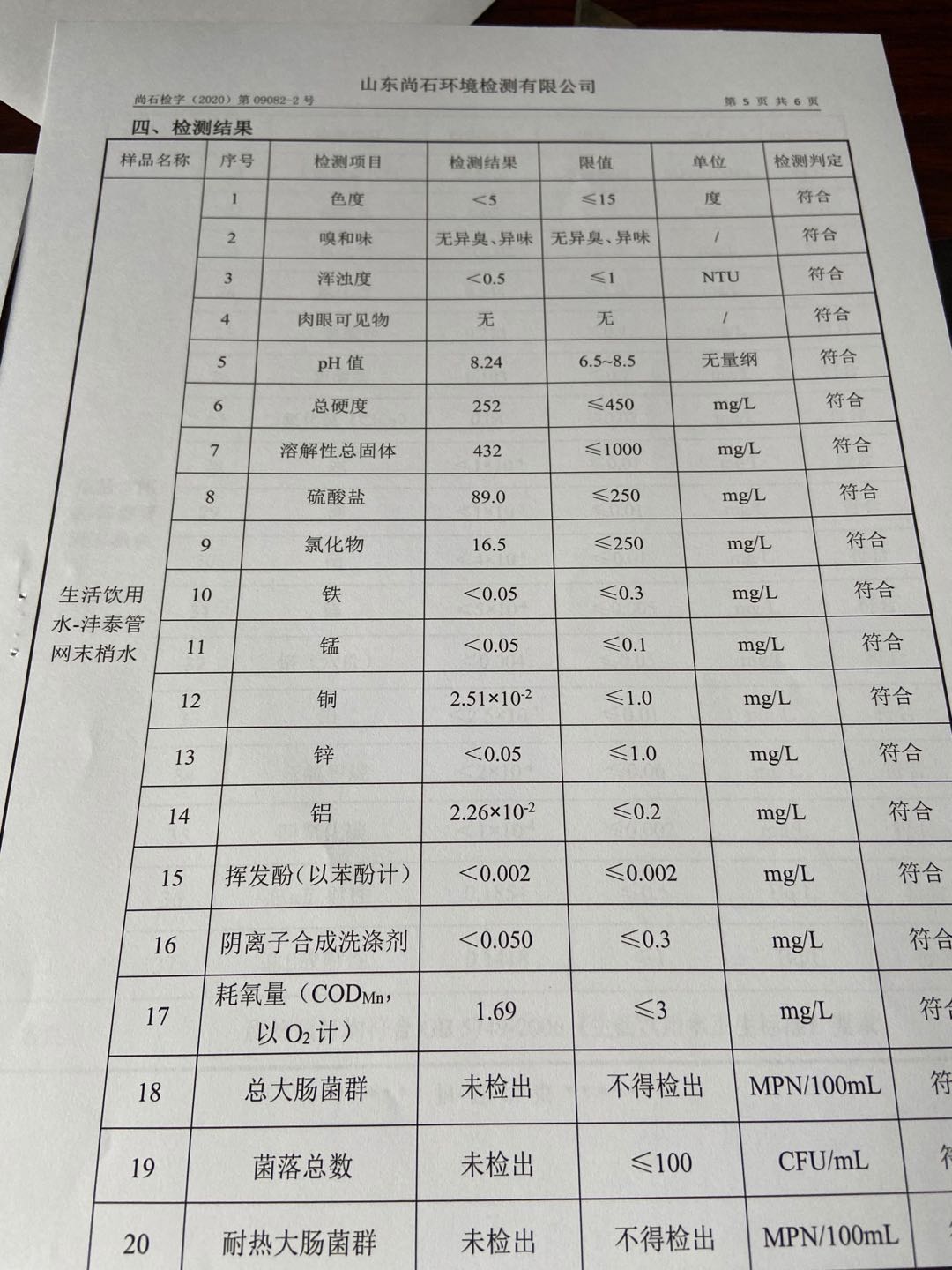 淄博沣泰供水服务有限公司末梢水月检报表