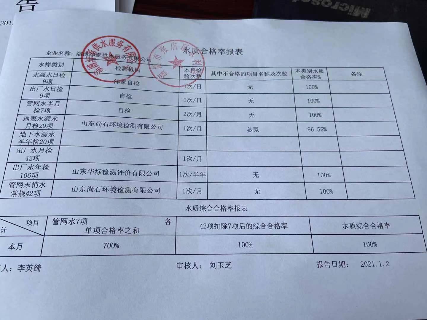 淄博沣泰供水服务有限公司水质合格率报表