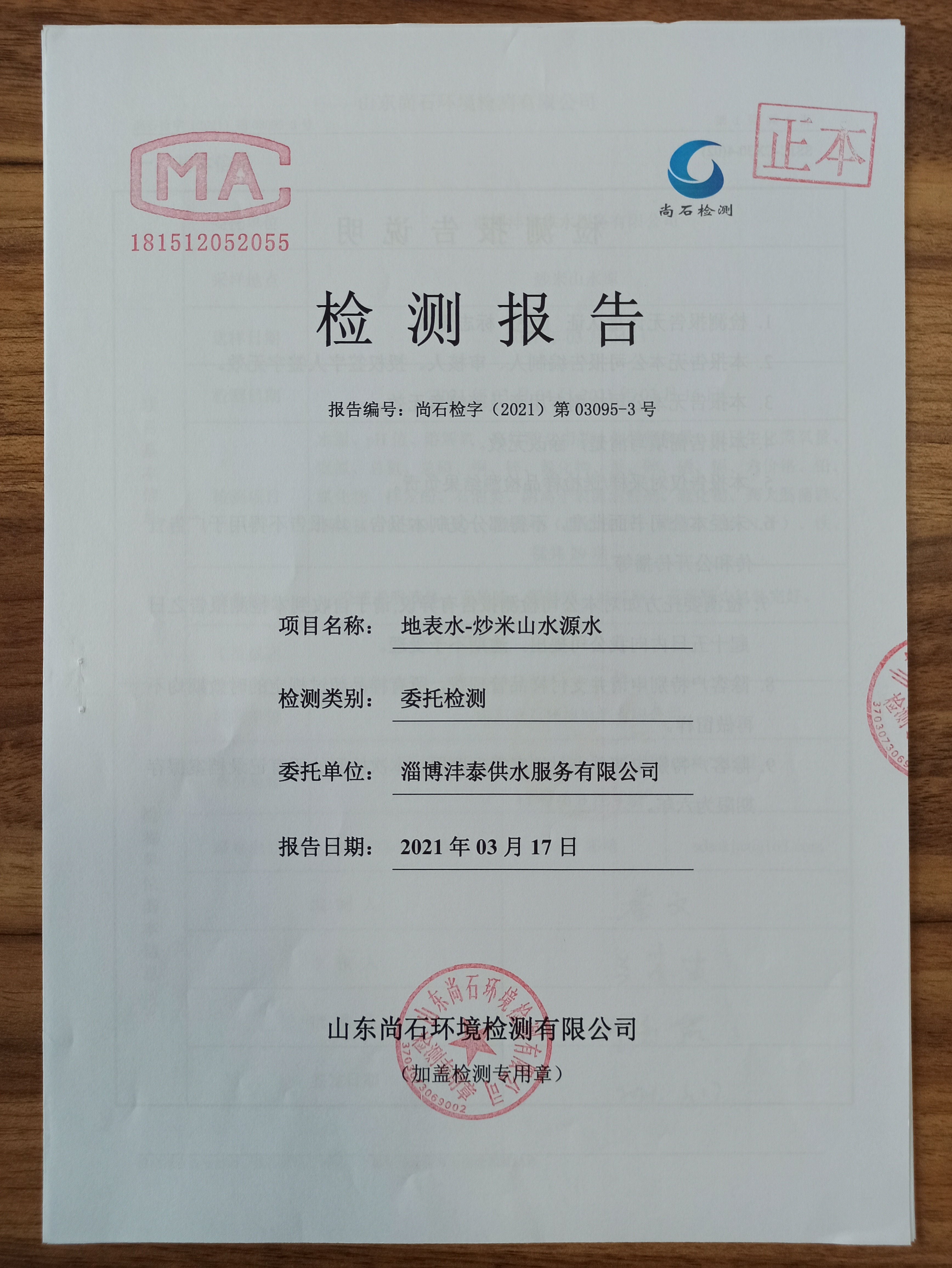 淄博沣泰供水服务有限公司地表水月检报告
