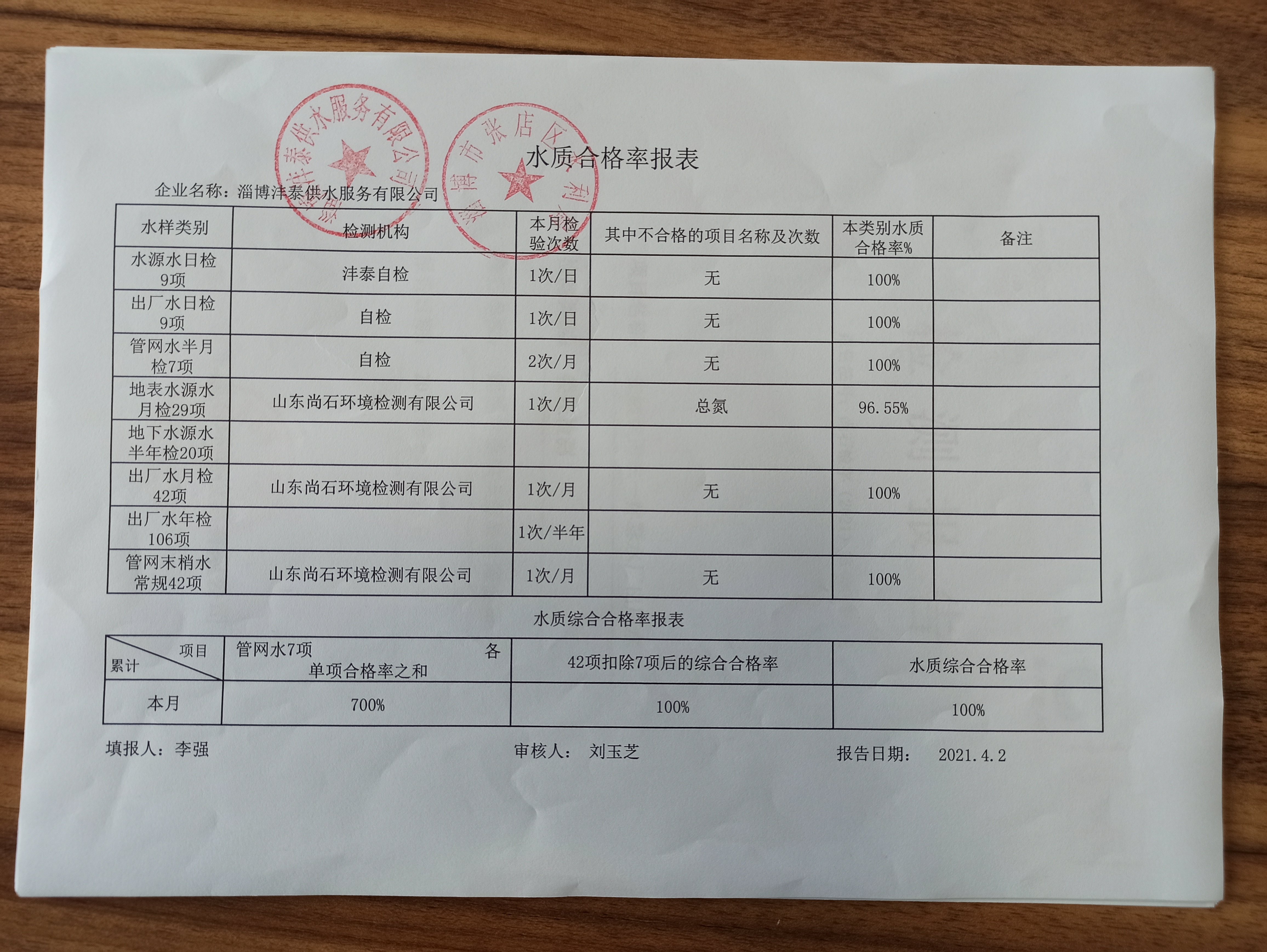 淄博沣泰供水服务有限公司水质合格率报表