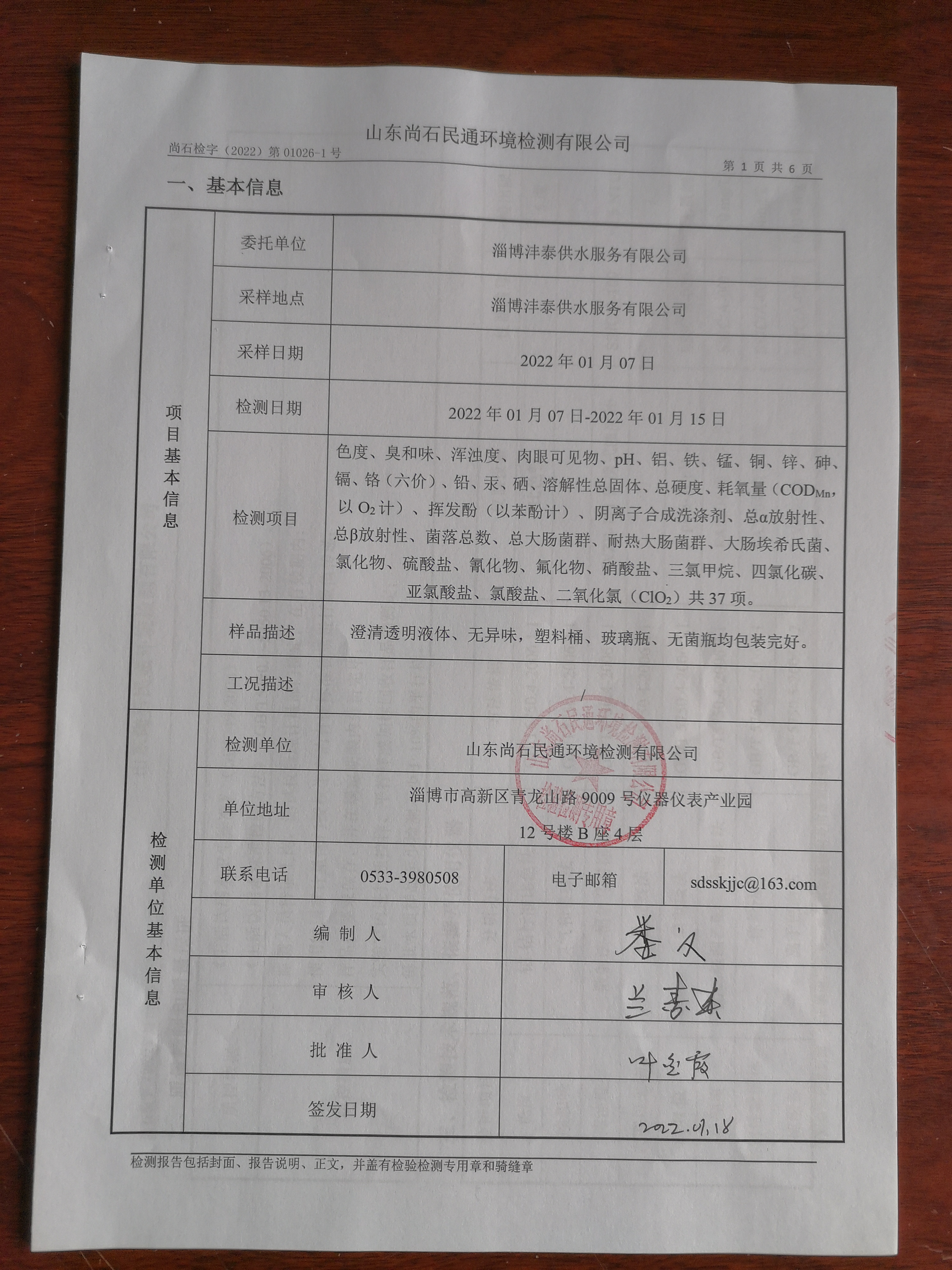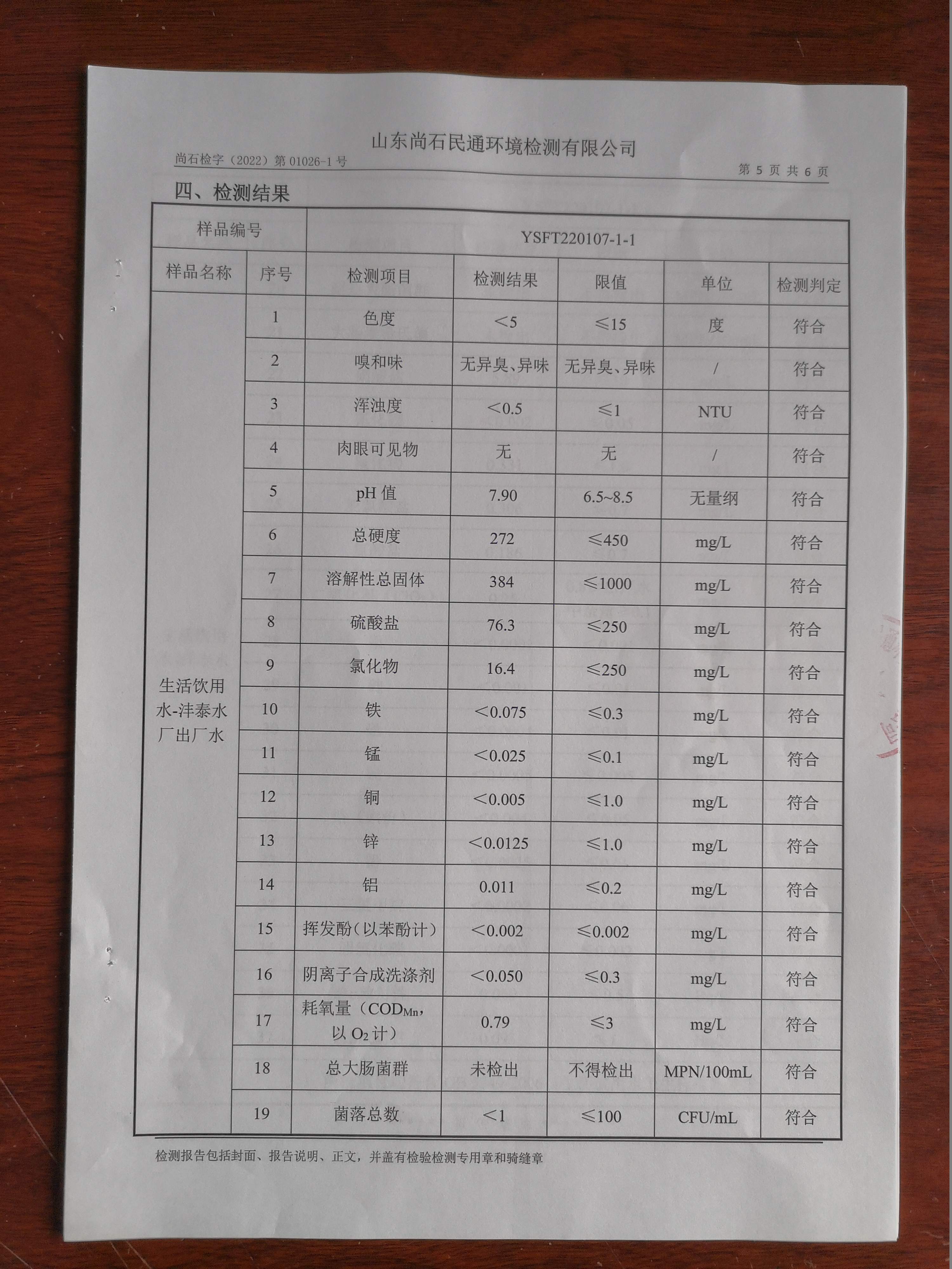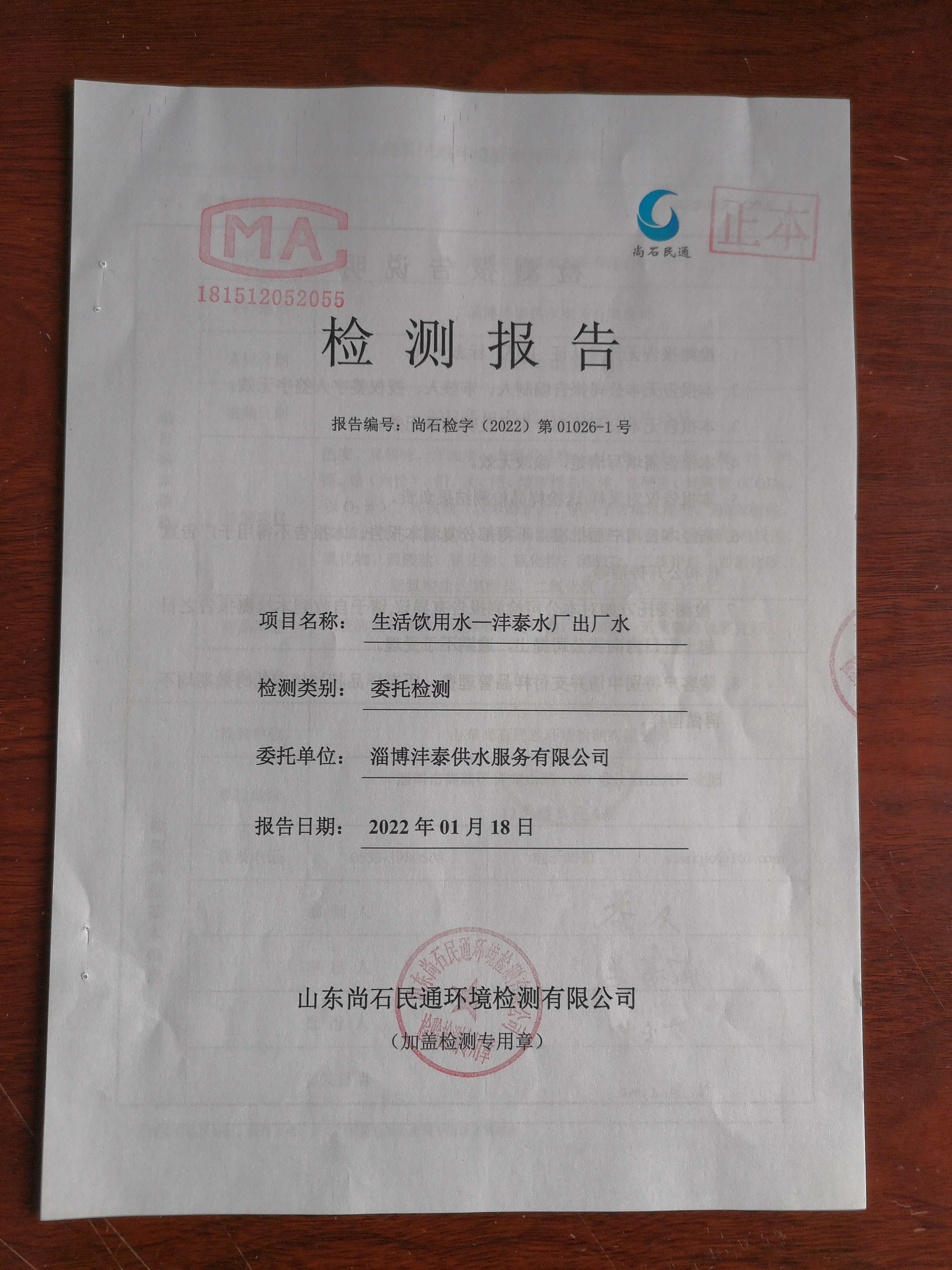 淄博沣泰供水服务有限公司出厂水月检报告