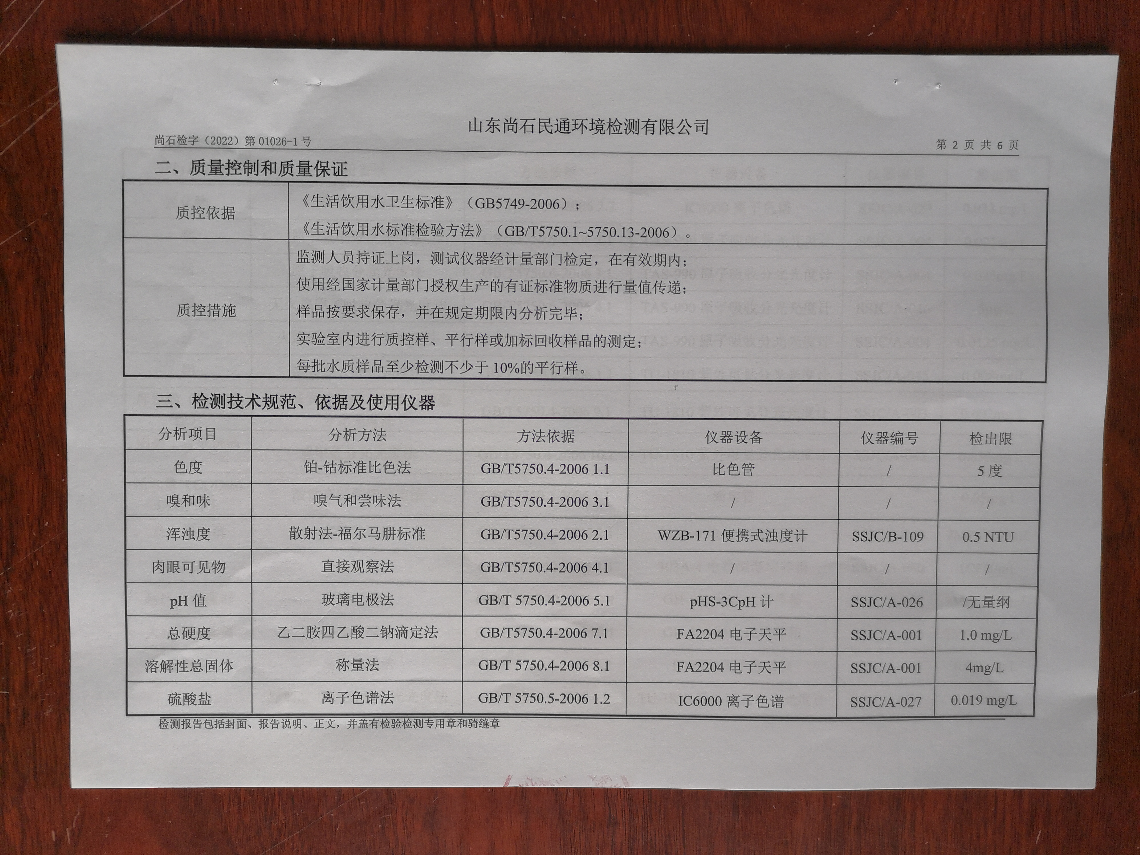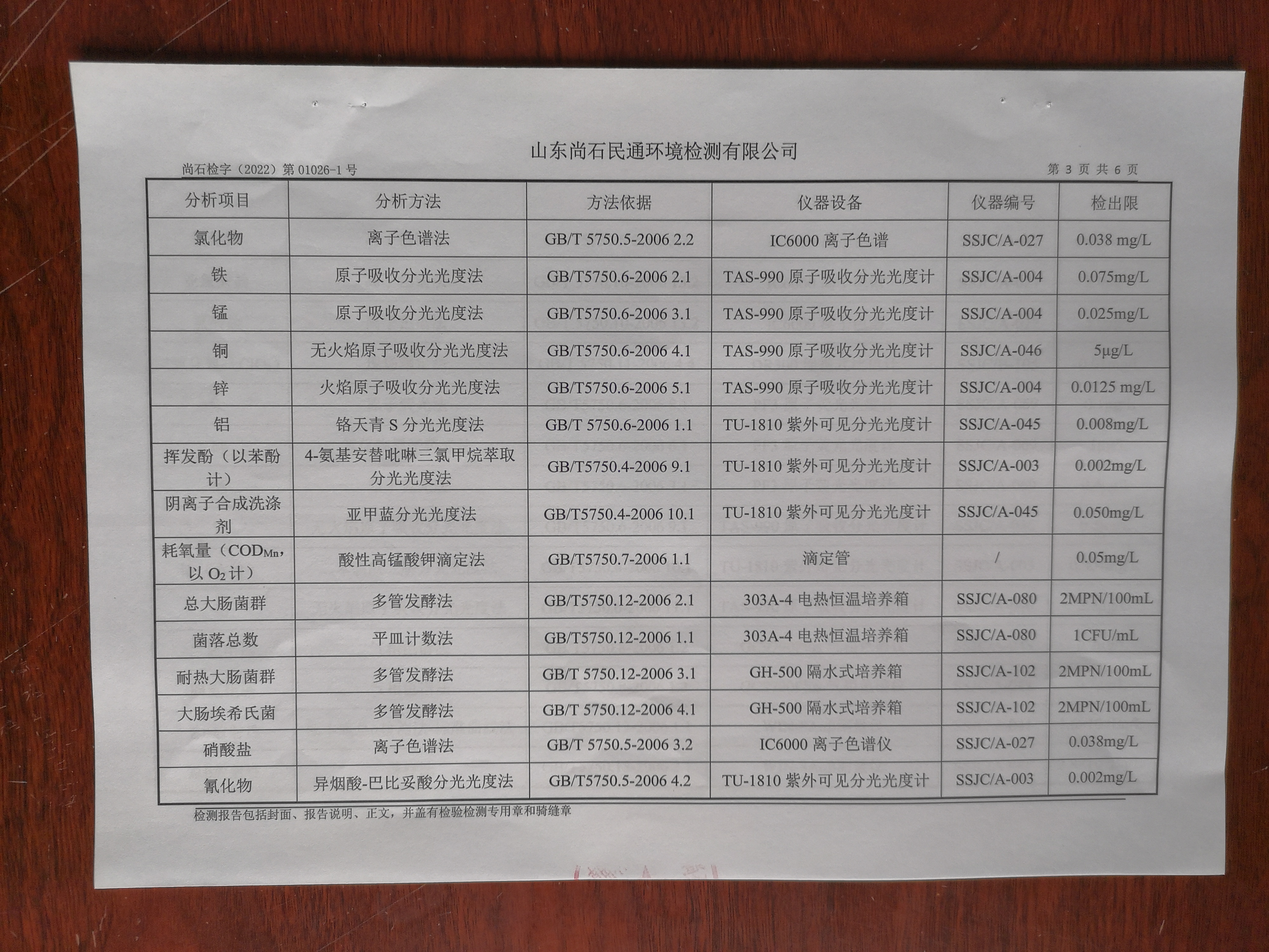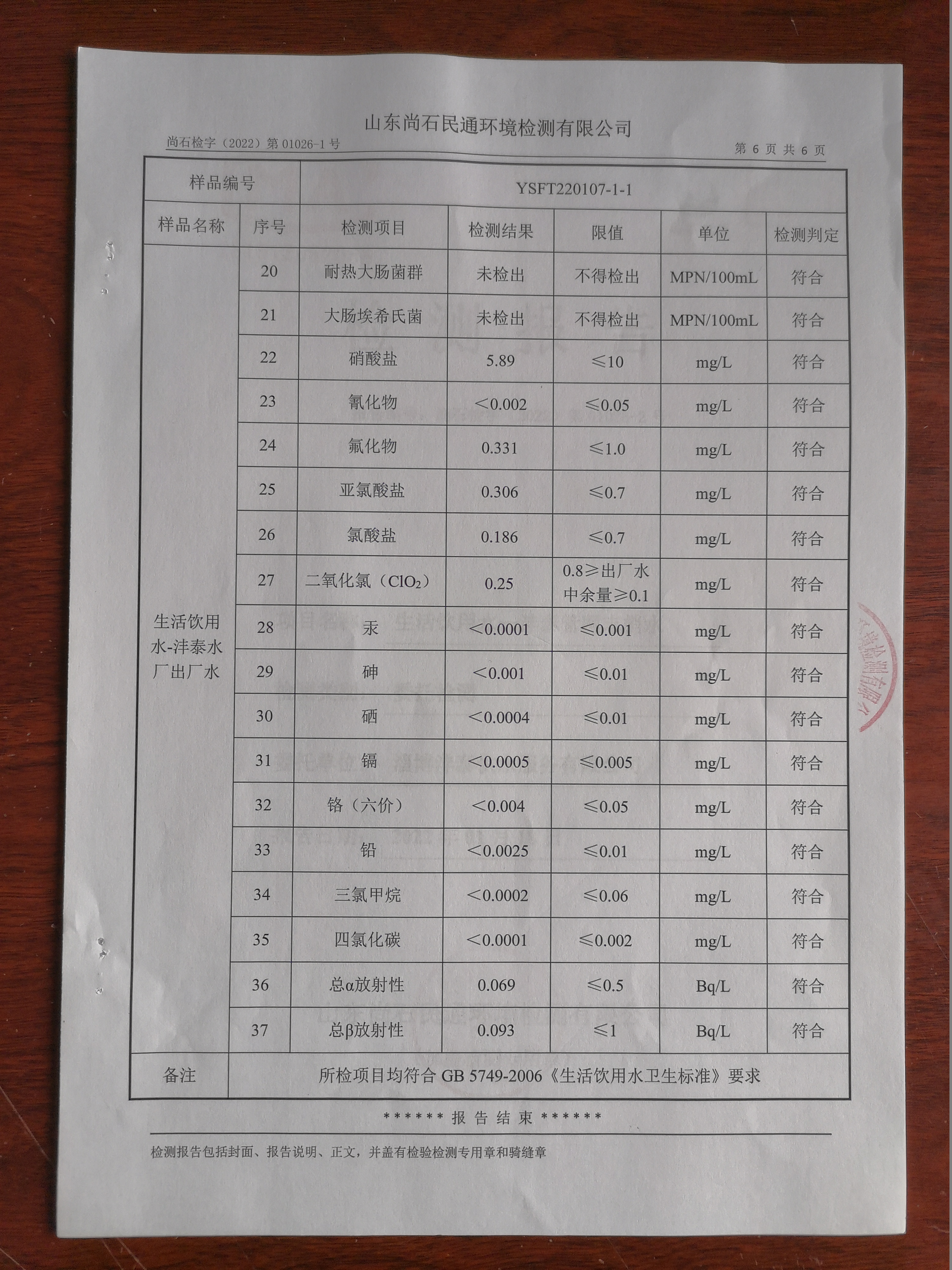 淄博沣泰供水服务有限公司出厂水月检报告