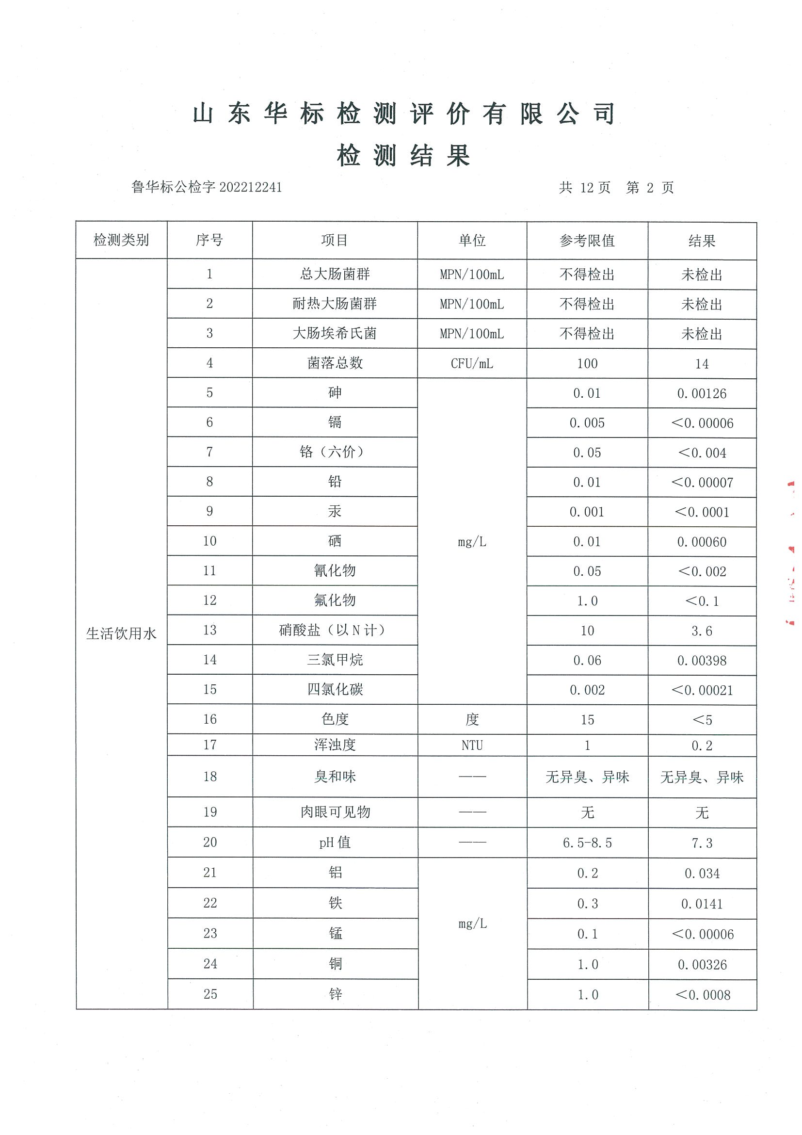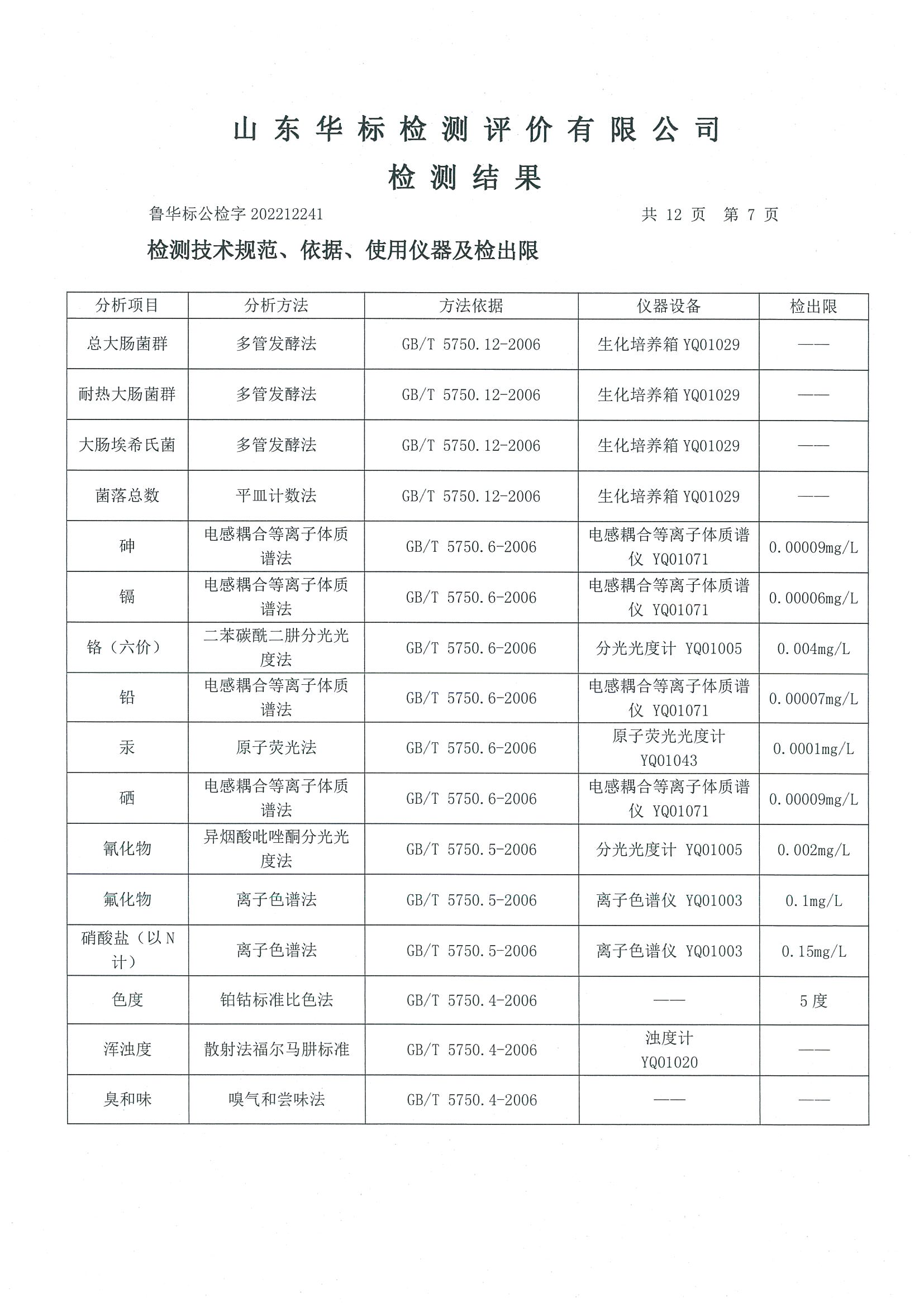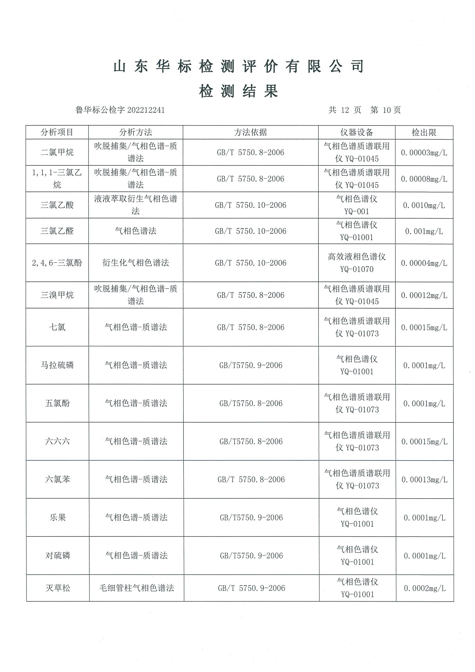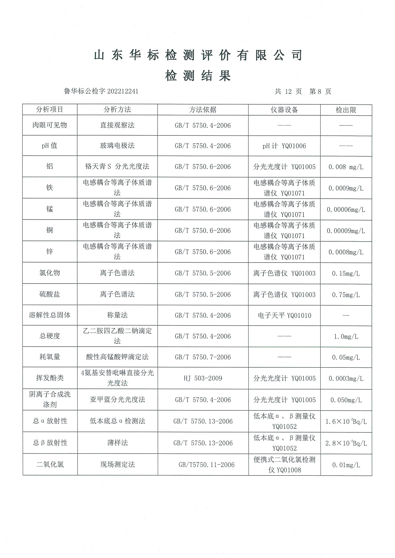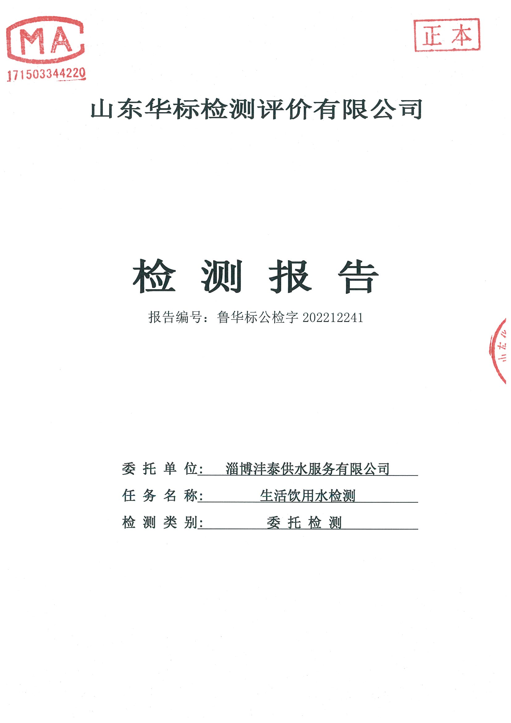 淄博沣泰供水服务有限公司出厂水月检报告