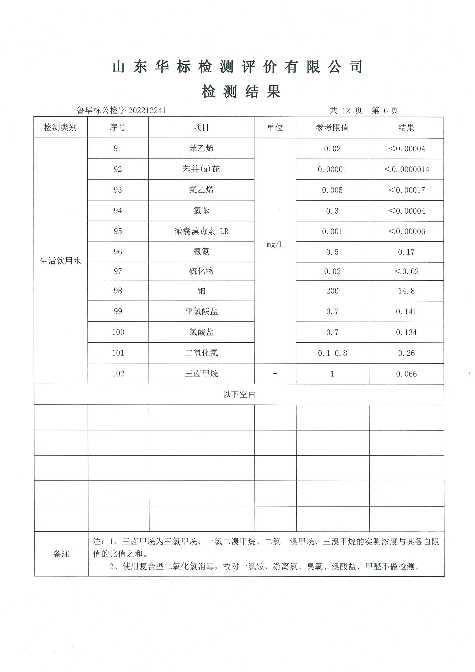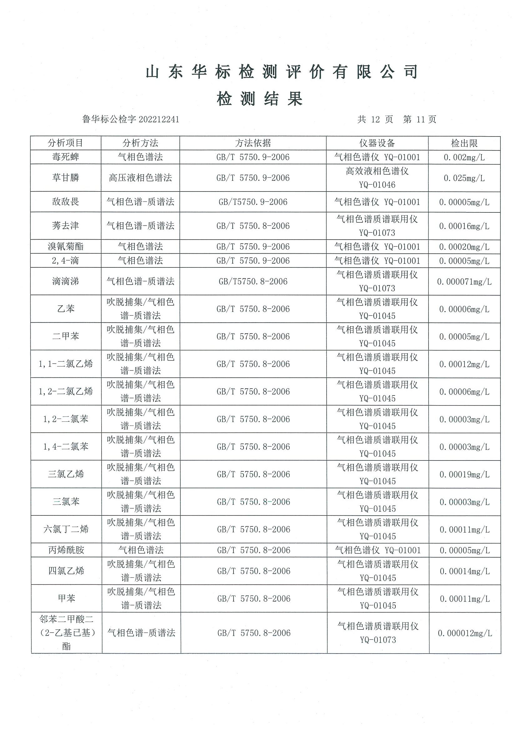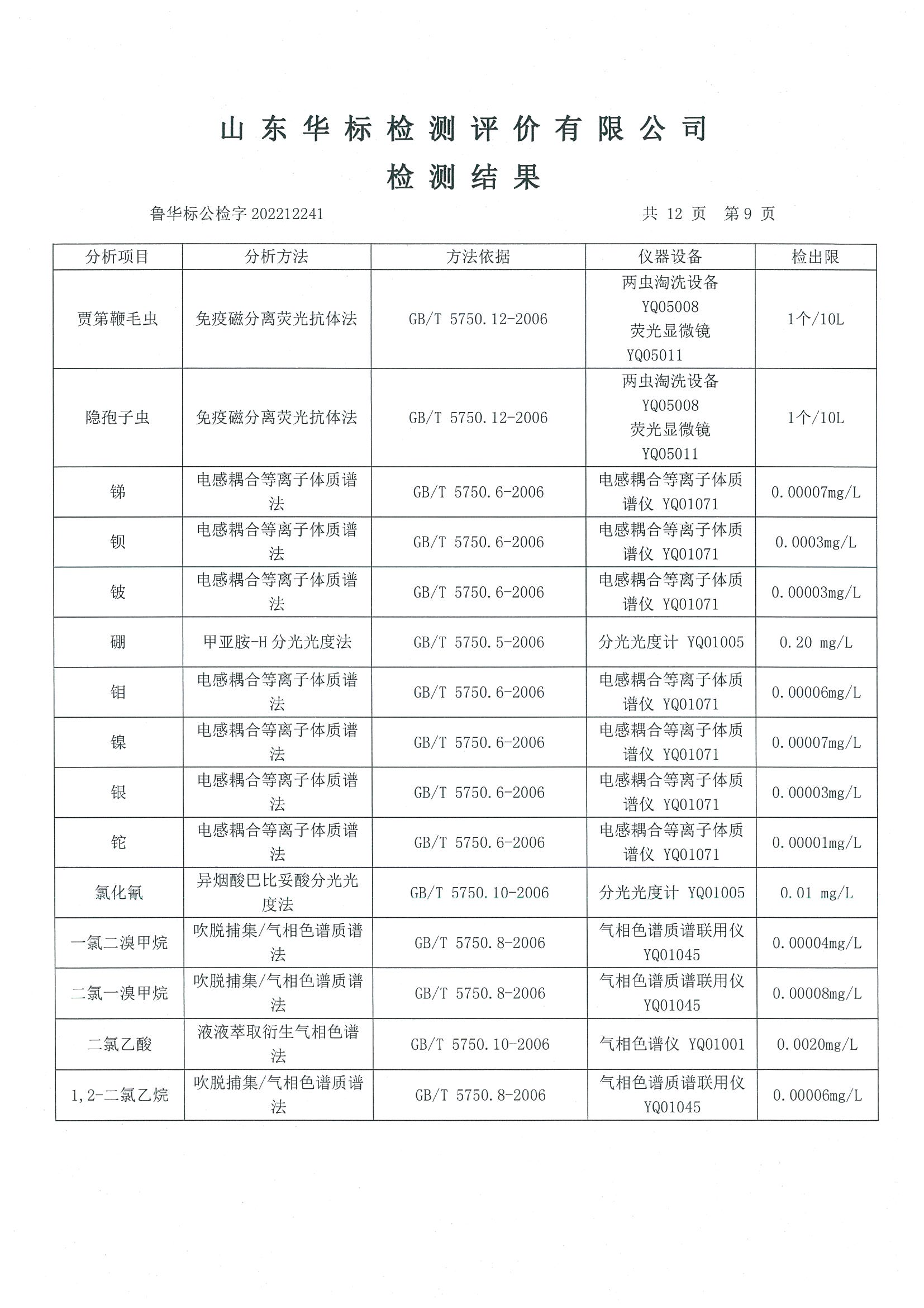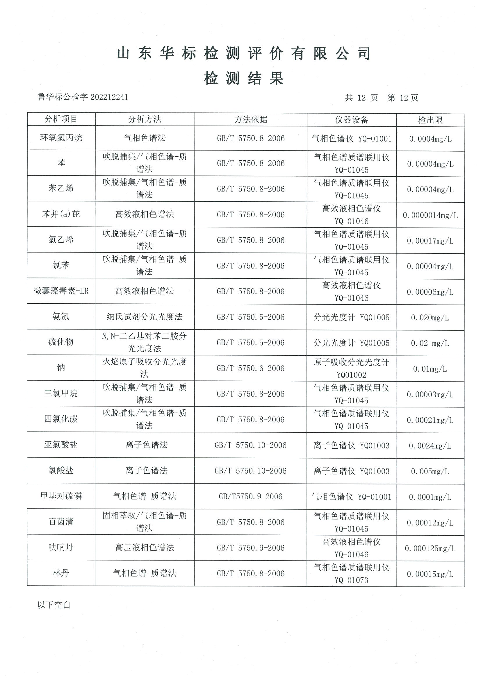 淄博沣泰供水服务有限公司出厂水月检报告