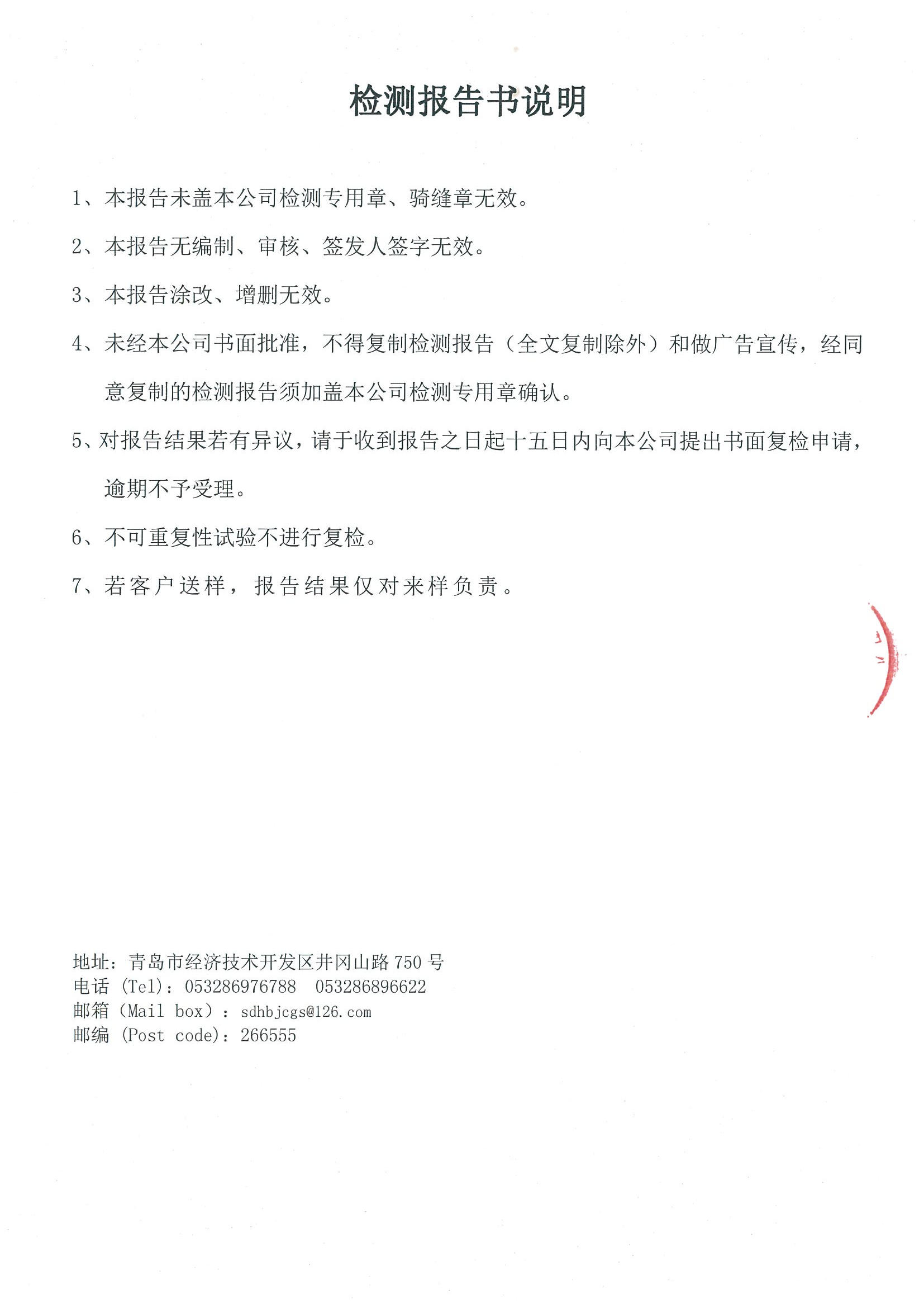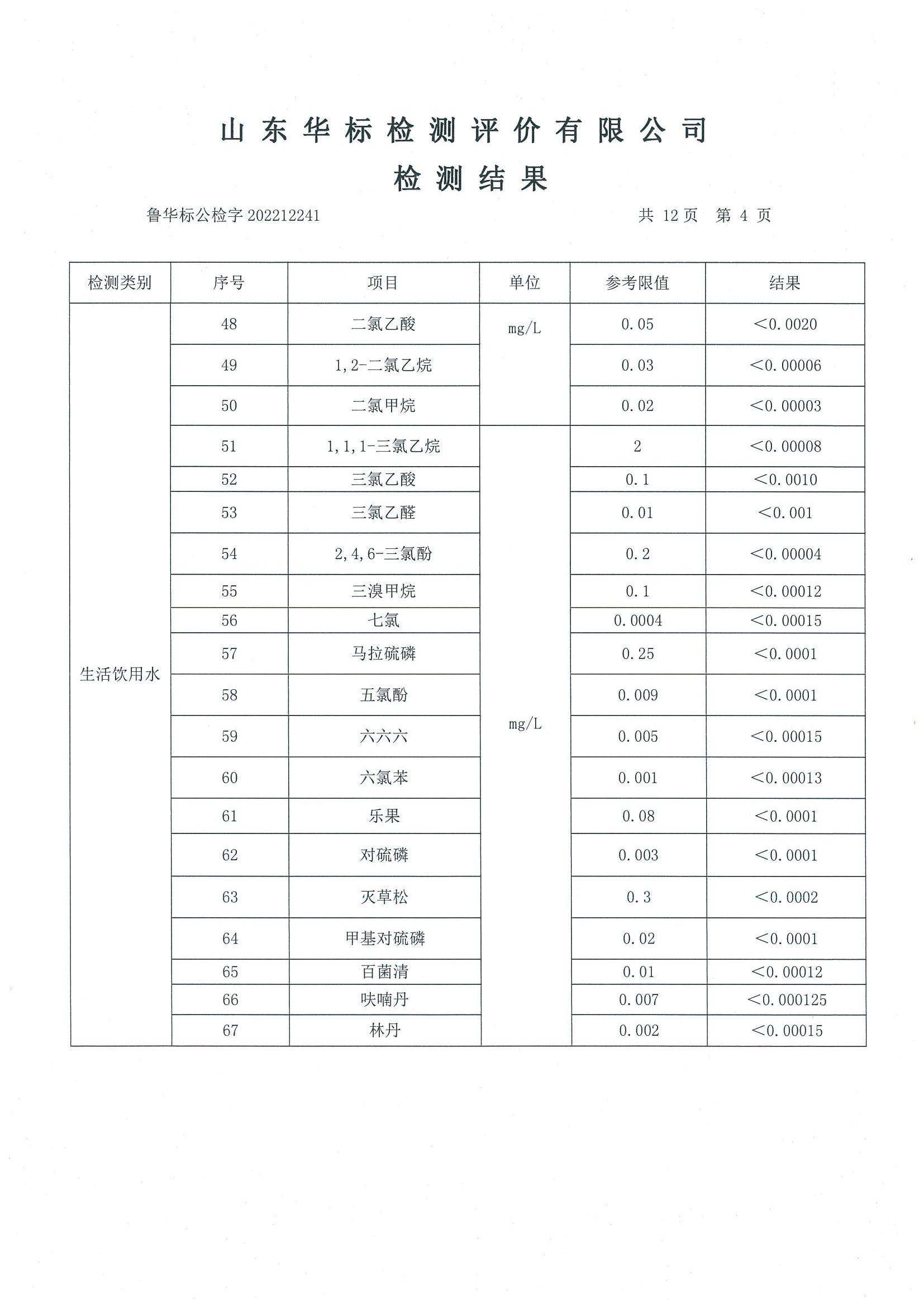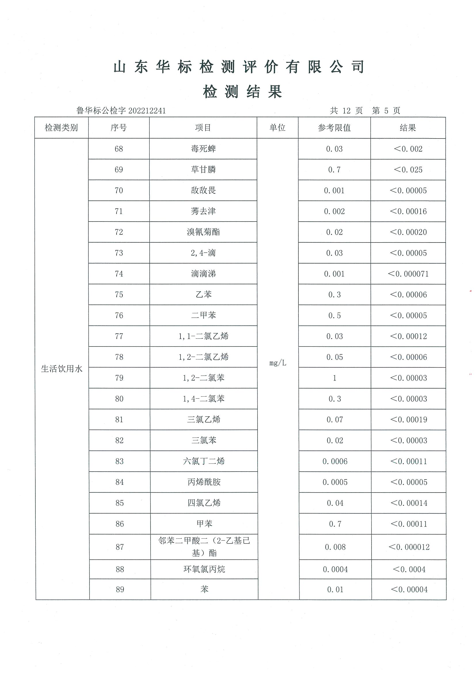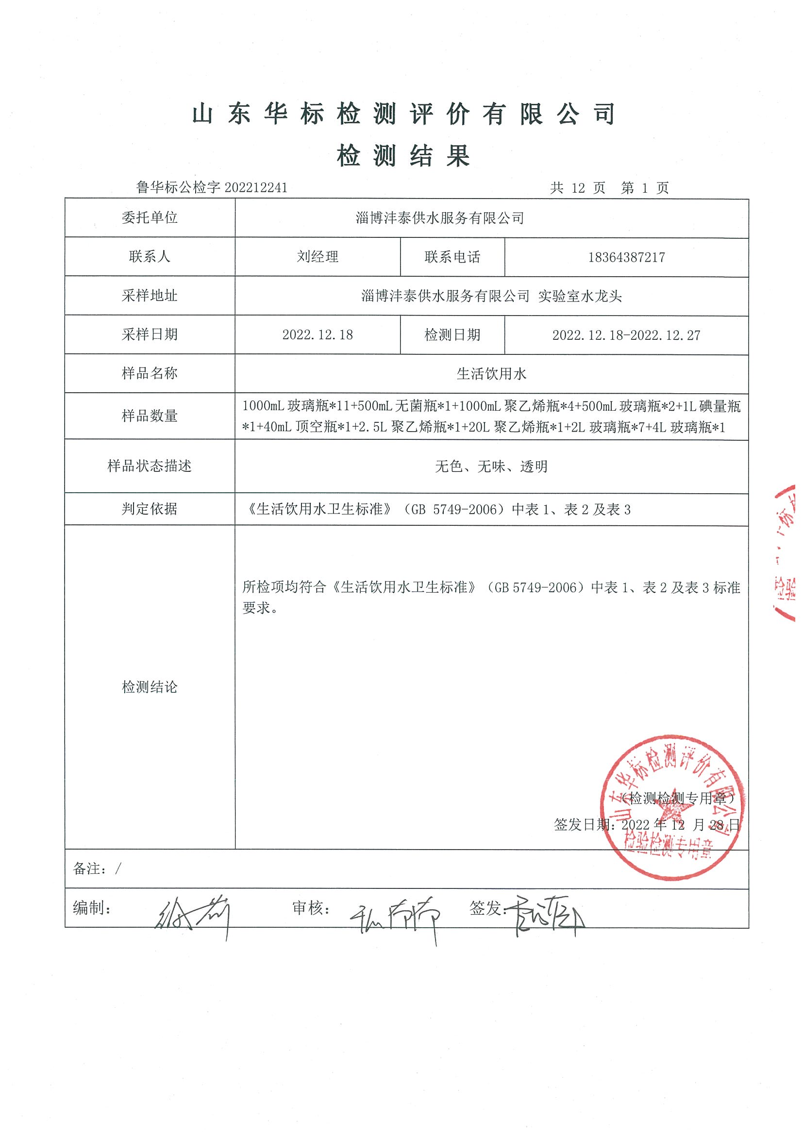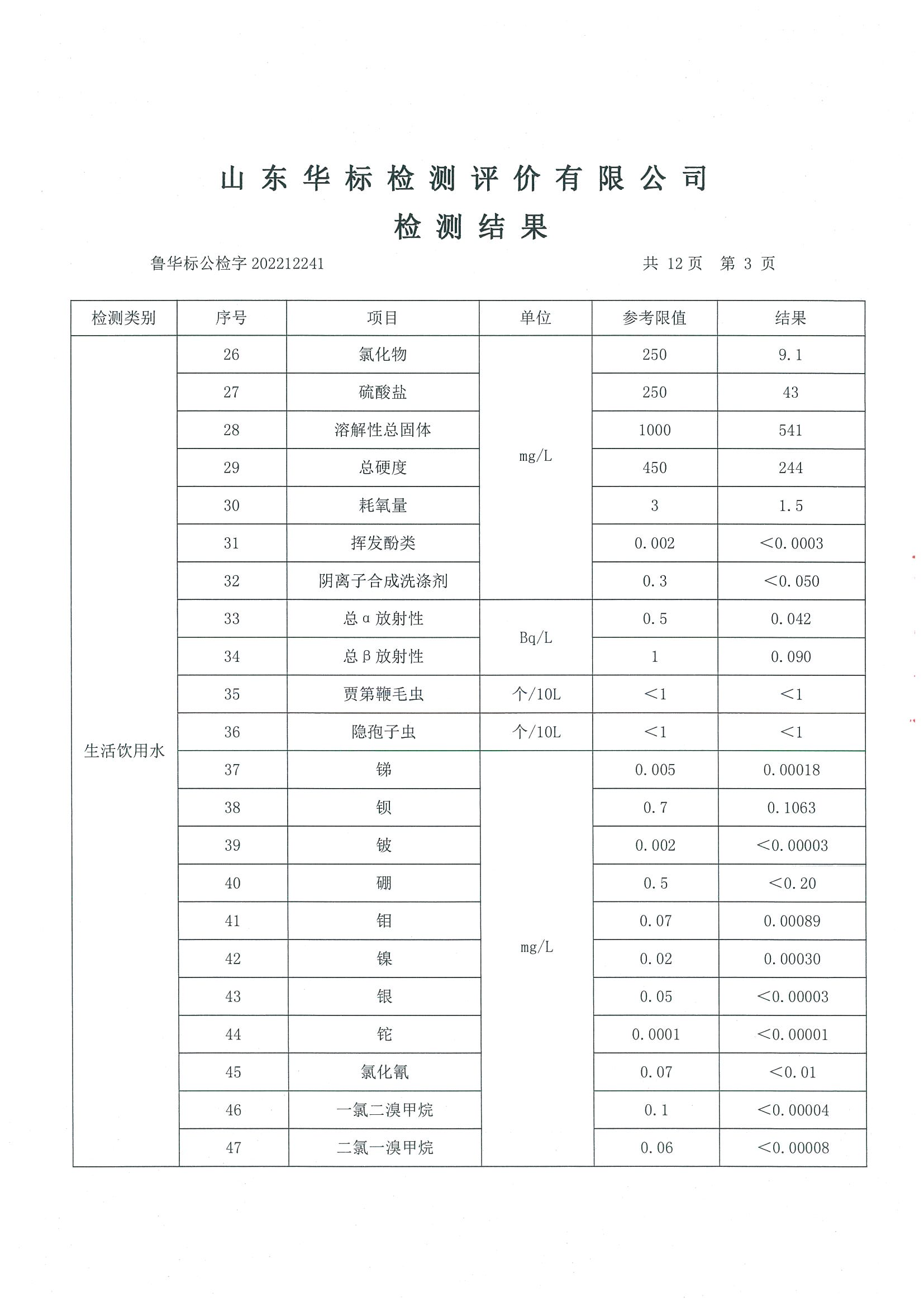 淄博沣泰供水服务有限公司出厂水月检报告