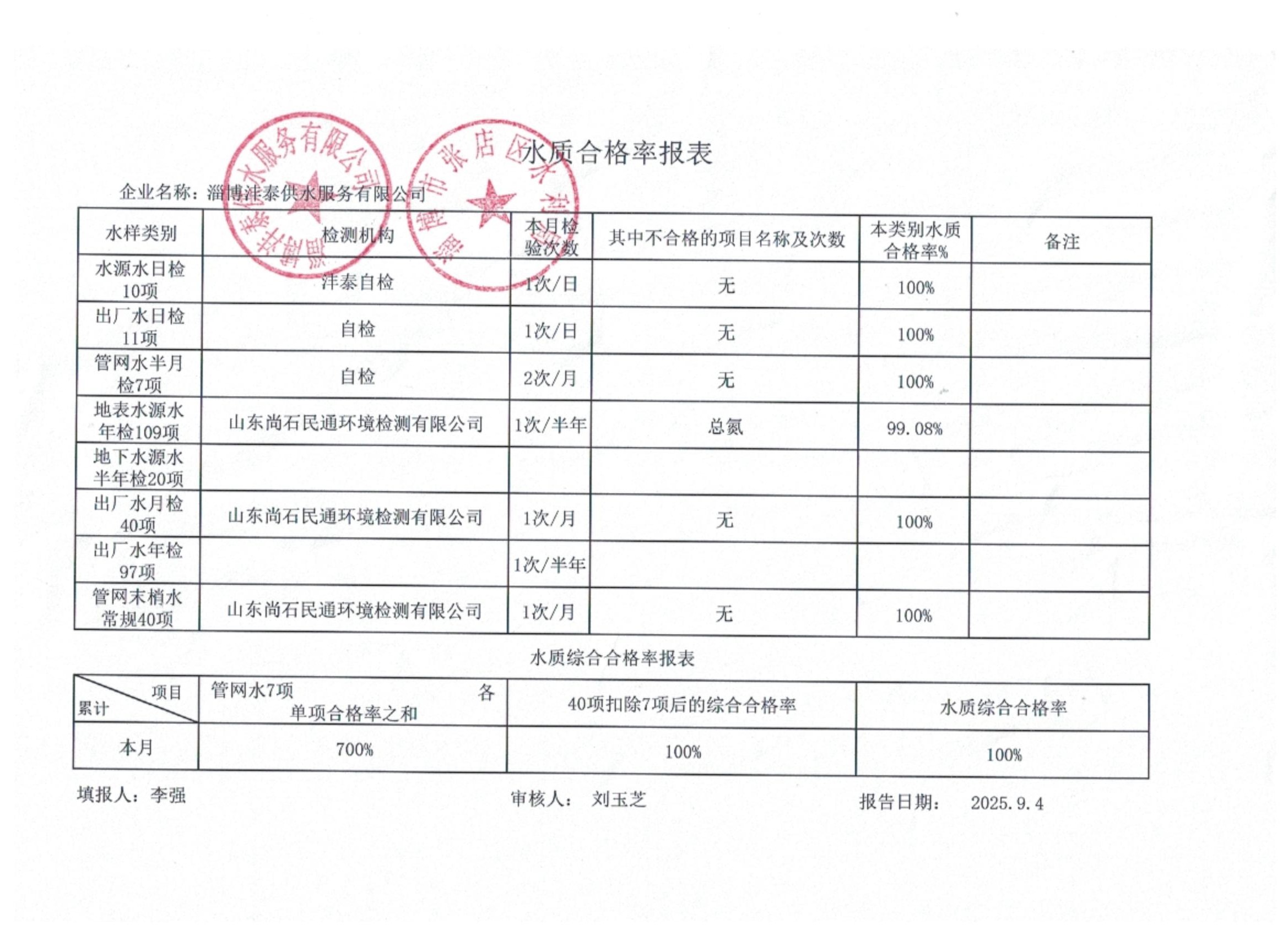 淄博沣泰供水服务有限公司水质合格率报表